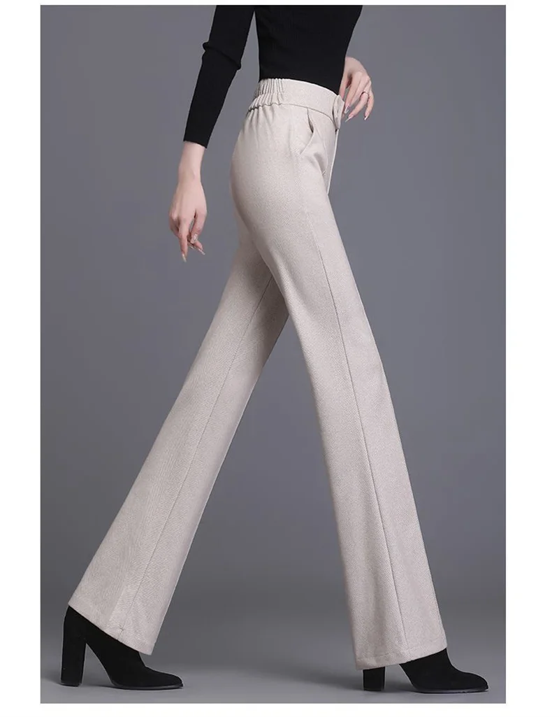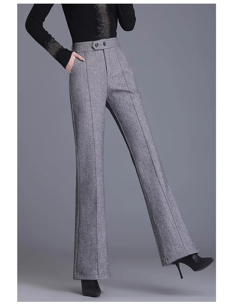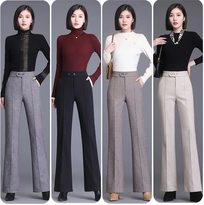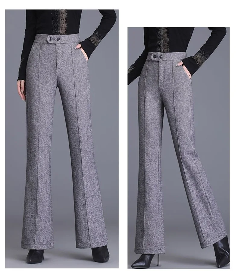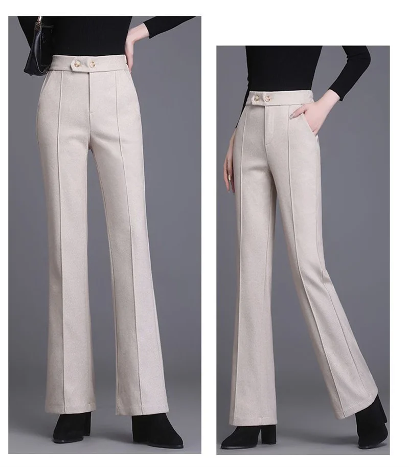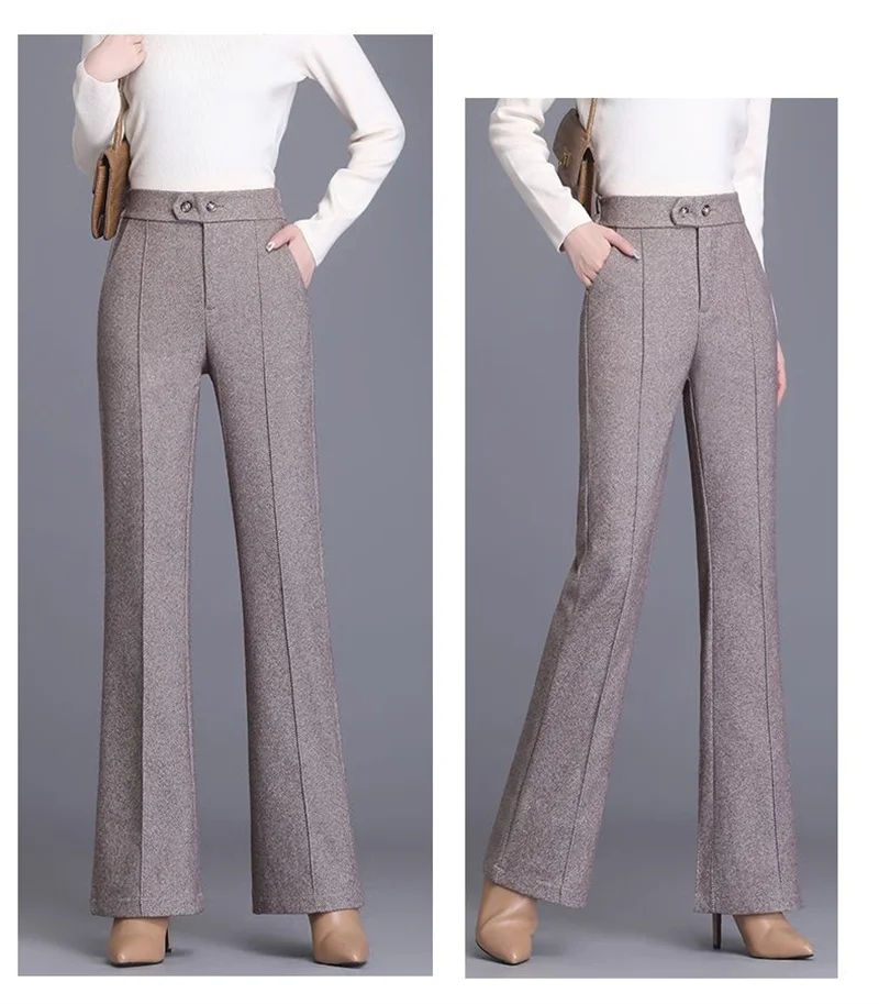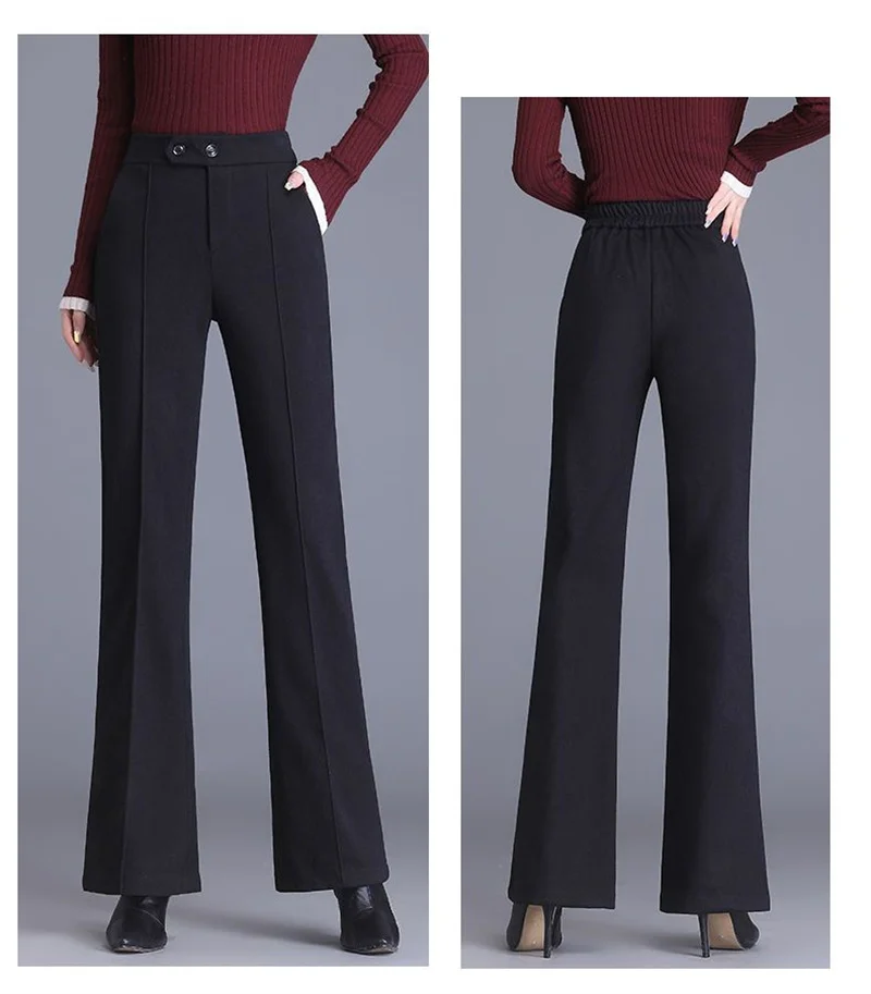 2024 Autumn Winter Women's Woolen Pants New Fashion High Waist Elastic Micro Flare Pants Slim Female Casual Wool Trousers 4XL