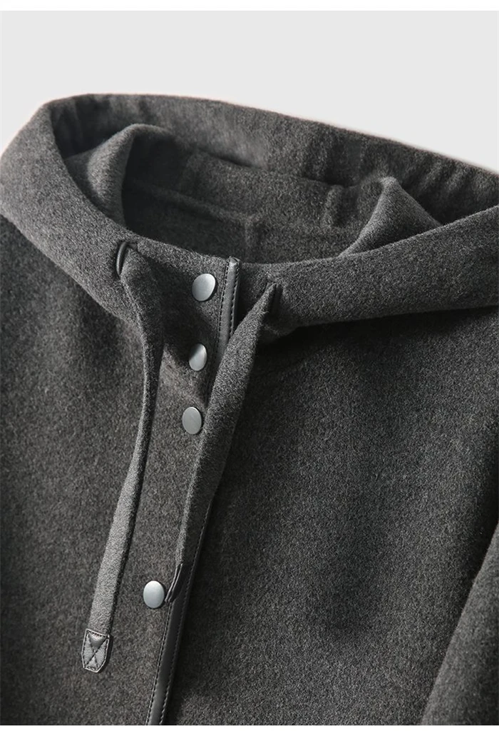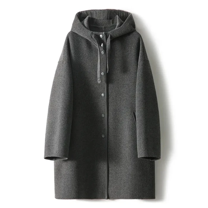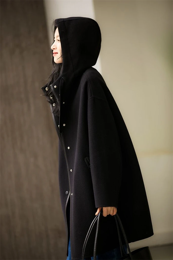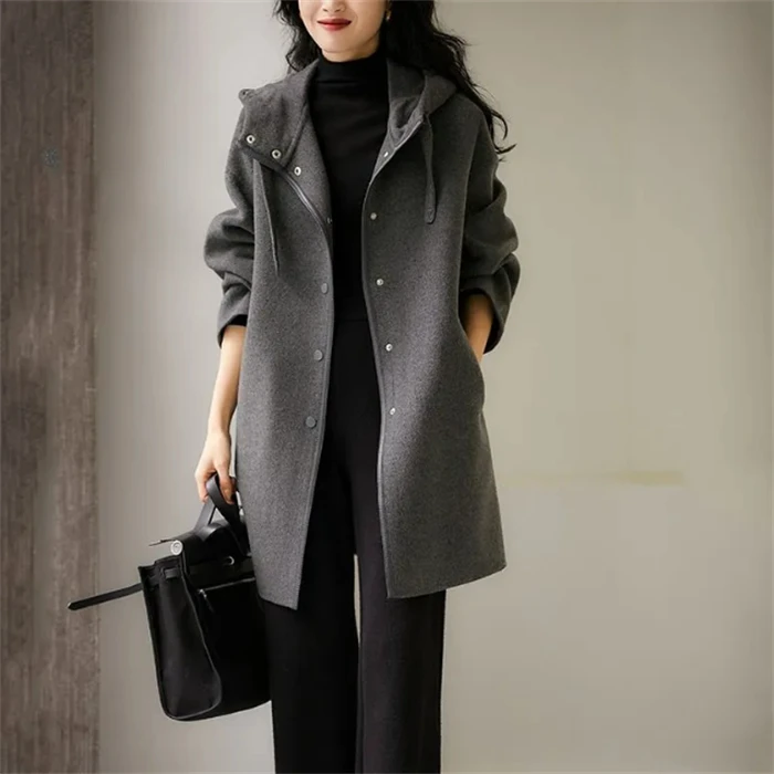 Autumn Winter Woolen Jacket Women New Loose Drawstring Hooded Coat Pure Colour Outerwear Fashion Covered Button Overcoat Female