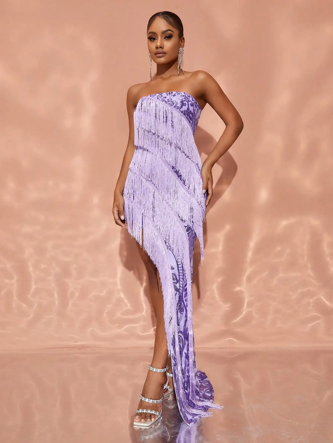 Introducing our violet luxe fringe gown, a creation that embodies the playful yet elegant spirit of modern femininity. This strapless gown is a vision in violet, adorned with an intricate pattern that adds depth and texture to its sleek silhouette. Lavish fringe details cascade down the dress, creating a dynamic movement that accentuates the bold thigh-high slit, adding a flirty touch to the sophisticated shape. Crafted for those who dare to dazzle, this gown is perfect for dancing the night away at glamorous parties, receptions, or any event where making an unforgettable impact is the order of the evening.