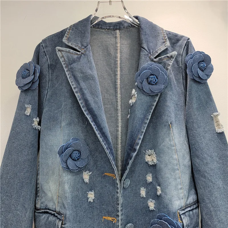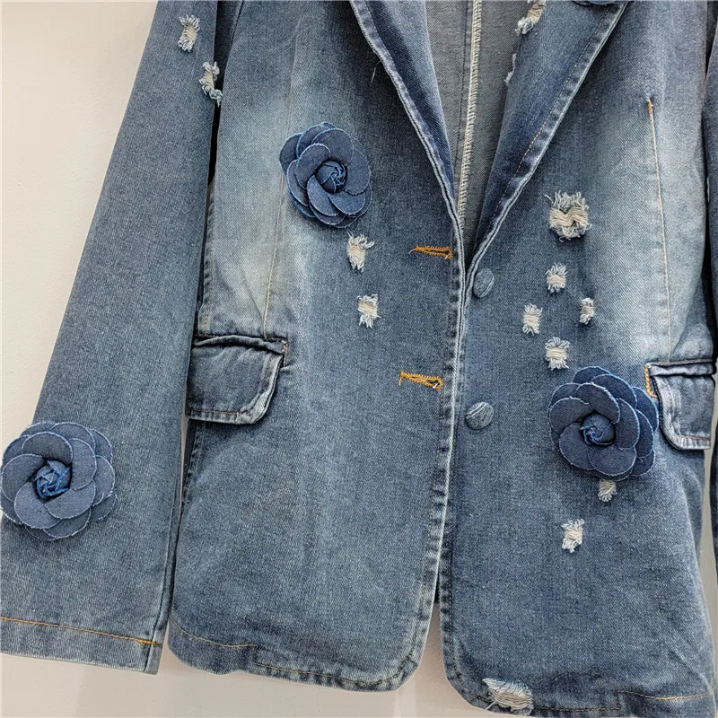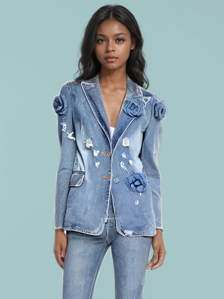 DEAT Fashion Vintage Women's Spliced Flower Denim Blazer Coat 2024 Autumn Trendy Lapel Long Sleeve Loose Jacket Female 11A0420