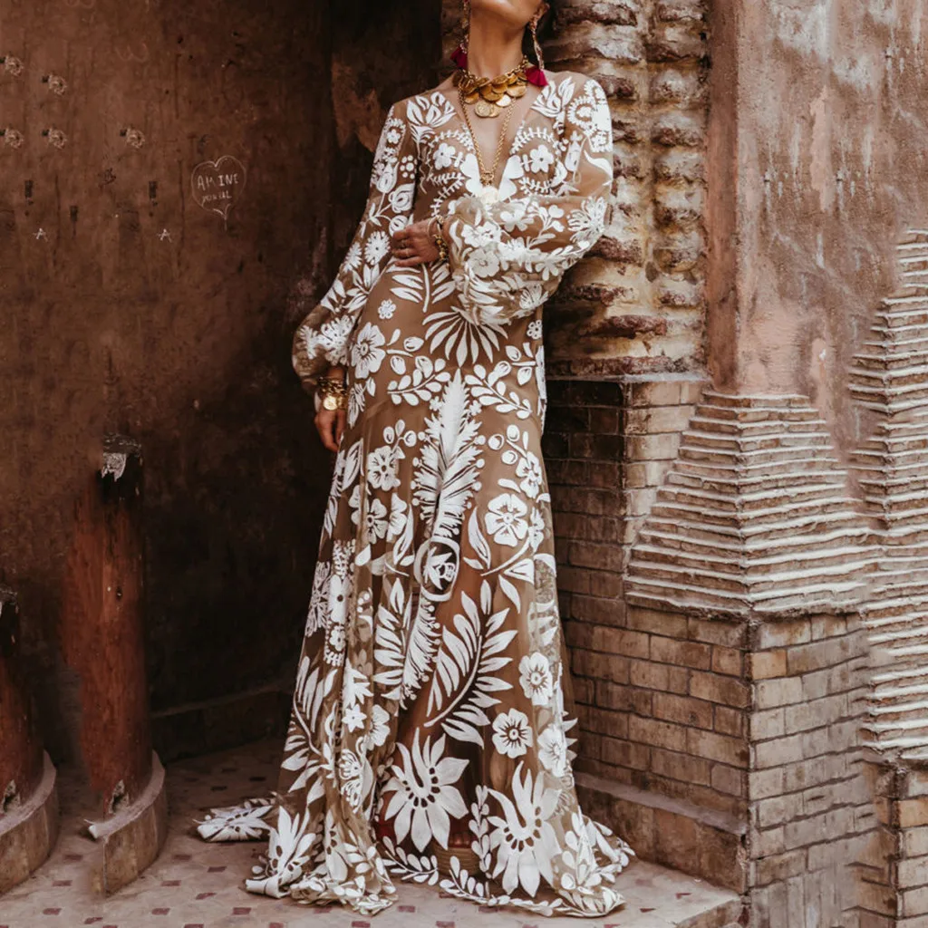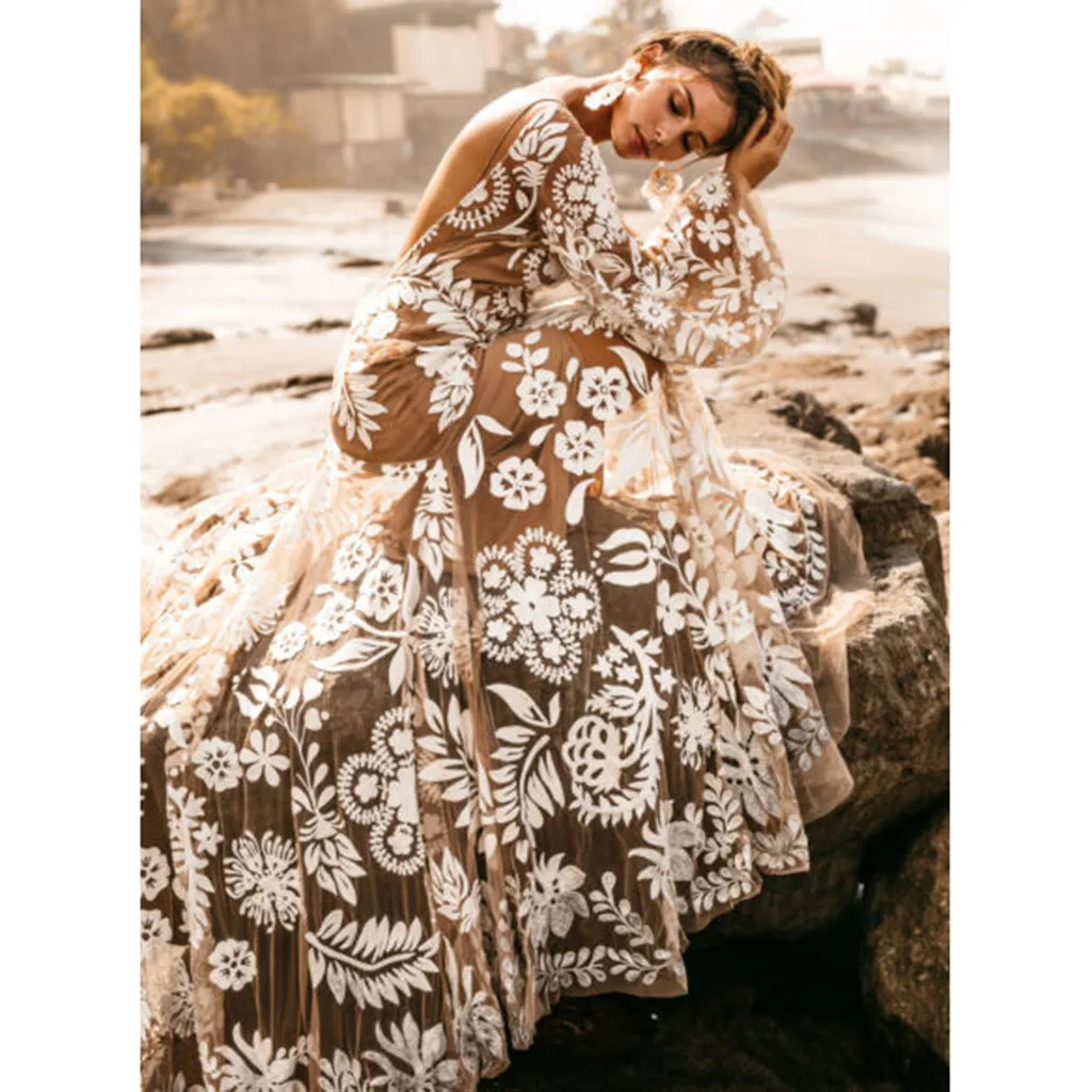 Dress Sleeve Gown Boho Backless Holiday V-Neck Pantern Women Evening Women's Dress Formal Floral Gown Wedding Wing Dress