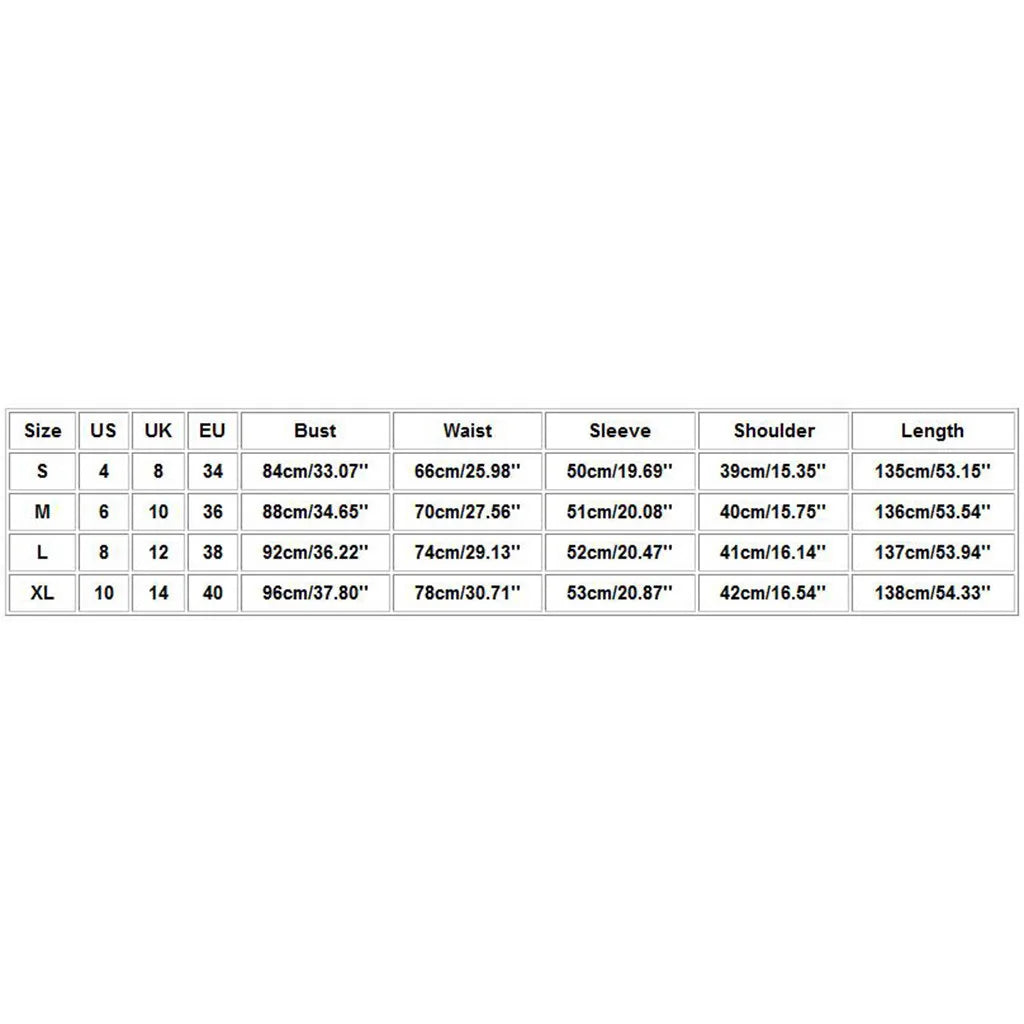 | Size:S | US:4 | UK:8 | EU:34 | Bust:84cm/33.07'' | Waist:66cm/25.98'' | Sleeve:50cm/19.69'' | Shoulder:39cm/15.35'' | Length:135cm/53.15'' |