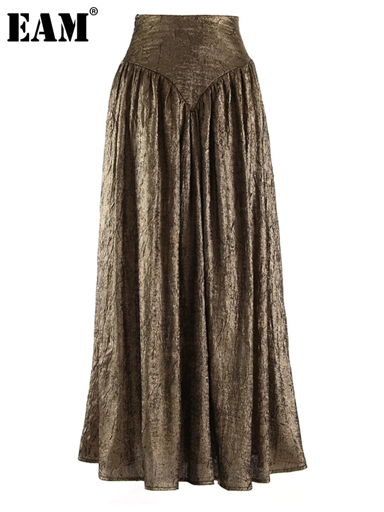[EAM] Women Dark Gold Color Pleated Elegant Long A-line Half-body Skirt High Wais Fashion Tide New Spring Autumn 2024 1DF9488