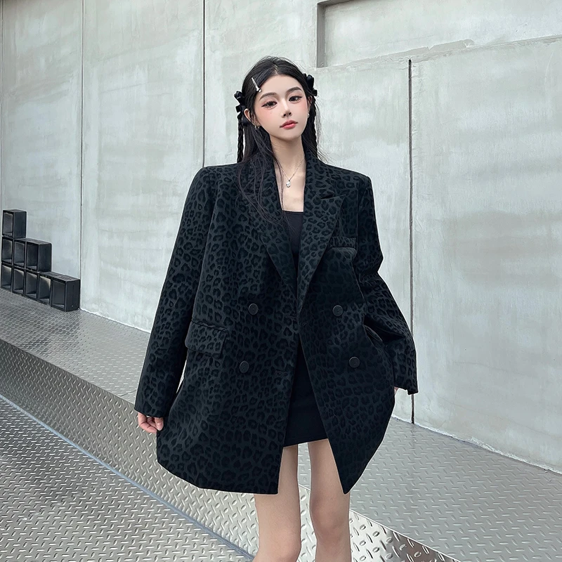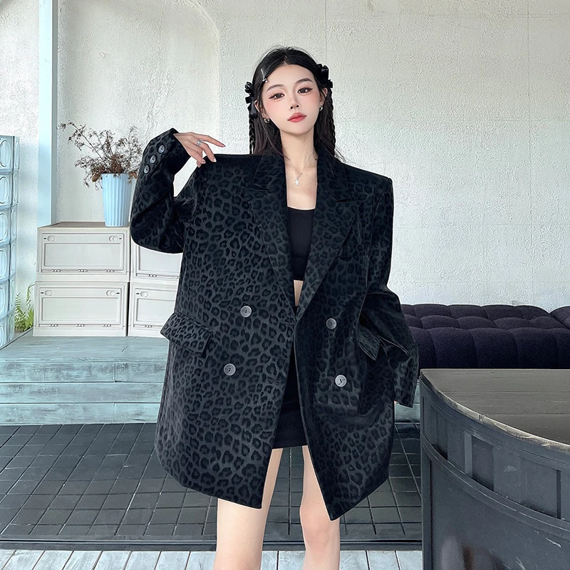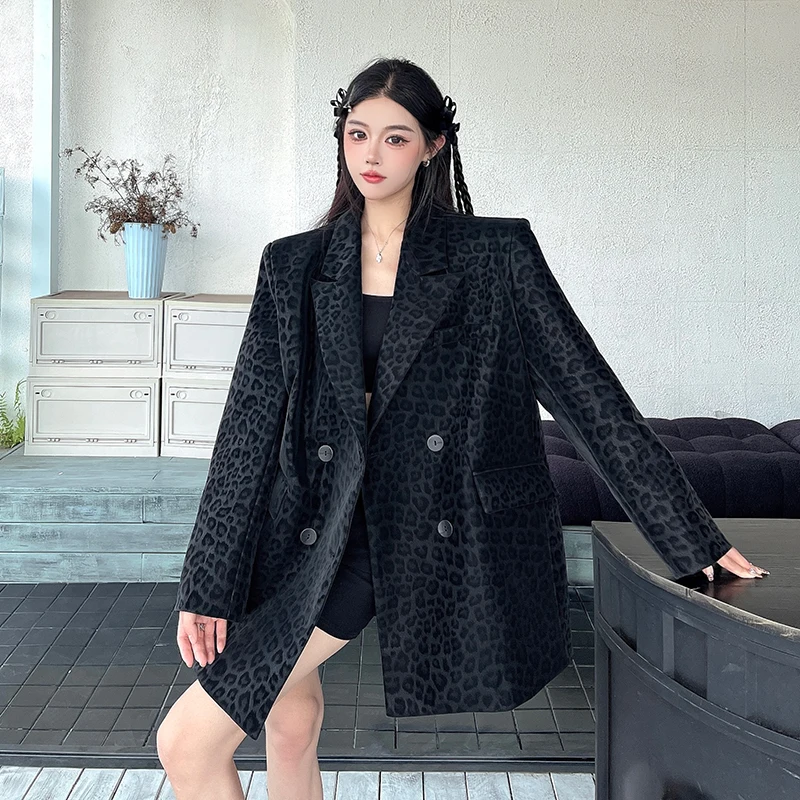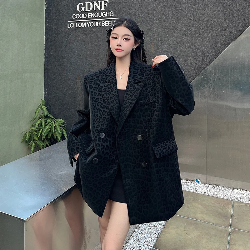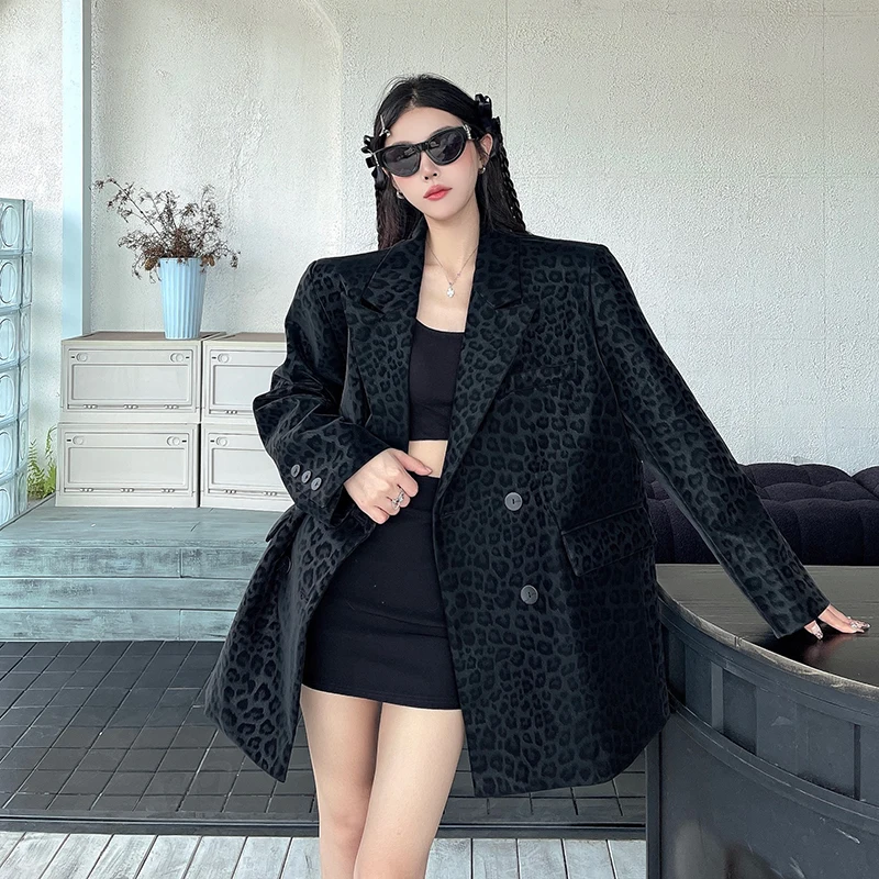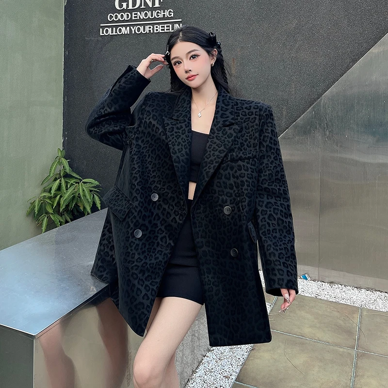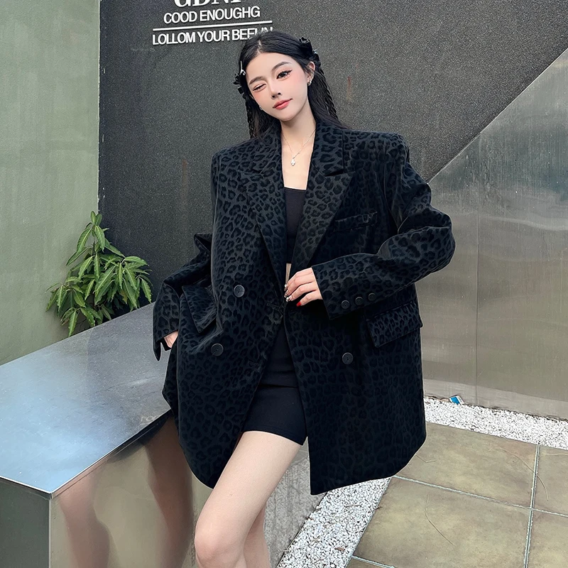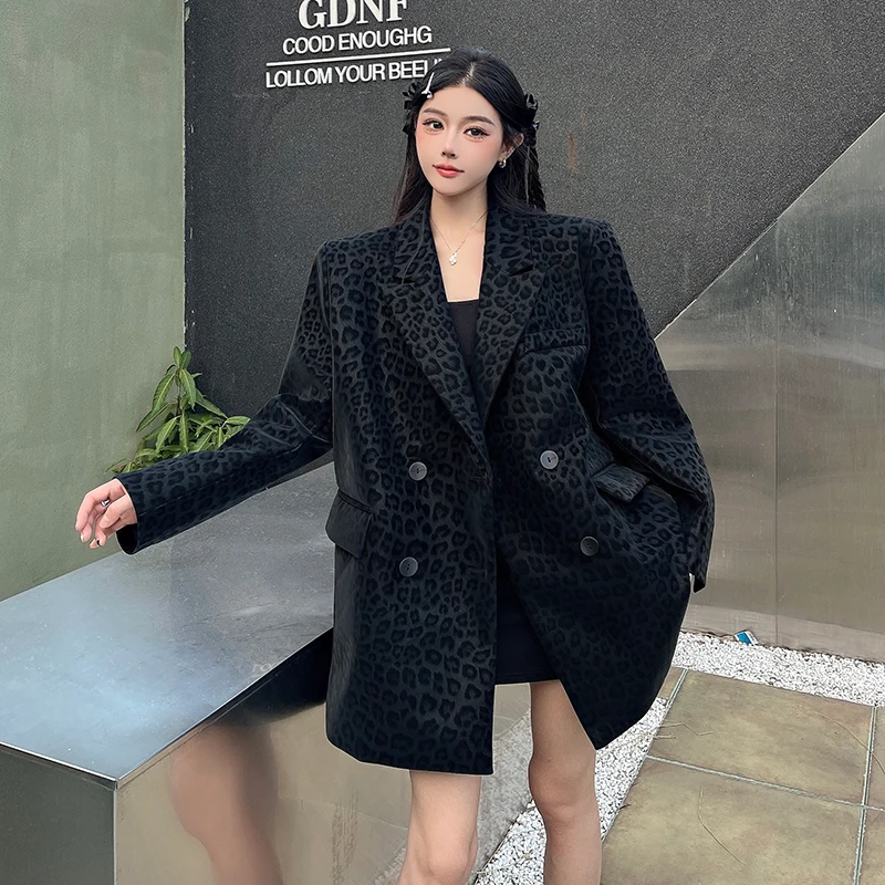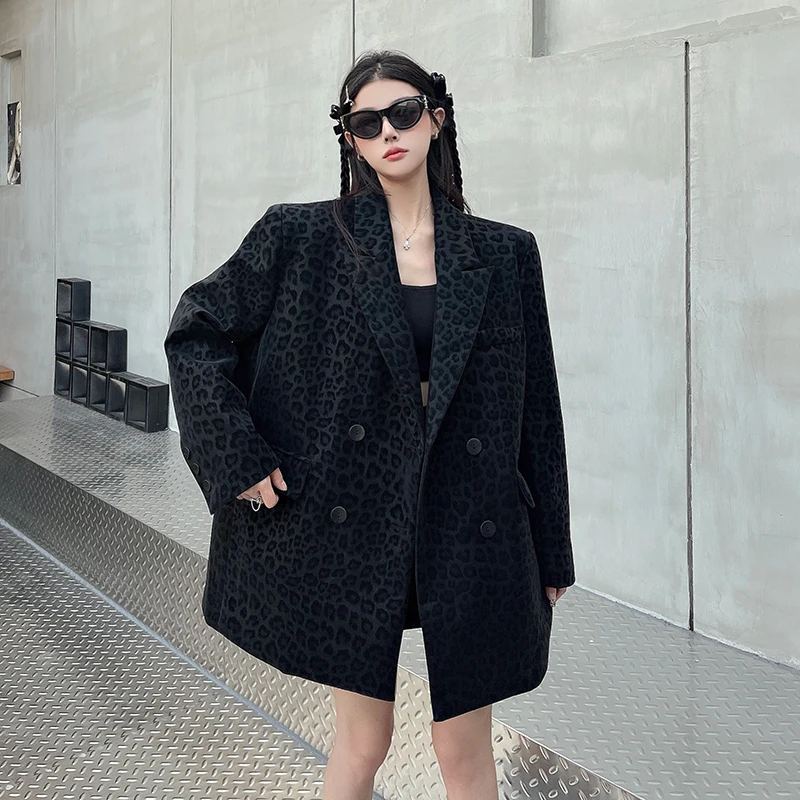 [EWQ] Streetwear Leopard Print Blazer Coat Long Sleeve Double Breasted Women Loose Office Lady Suit Jacket 2024 Winter 16O3380