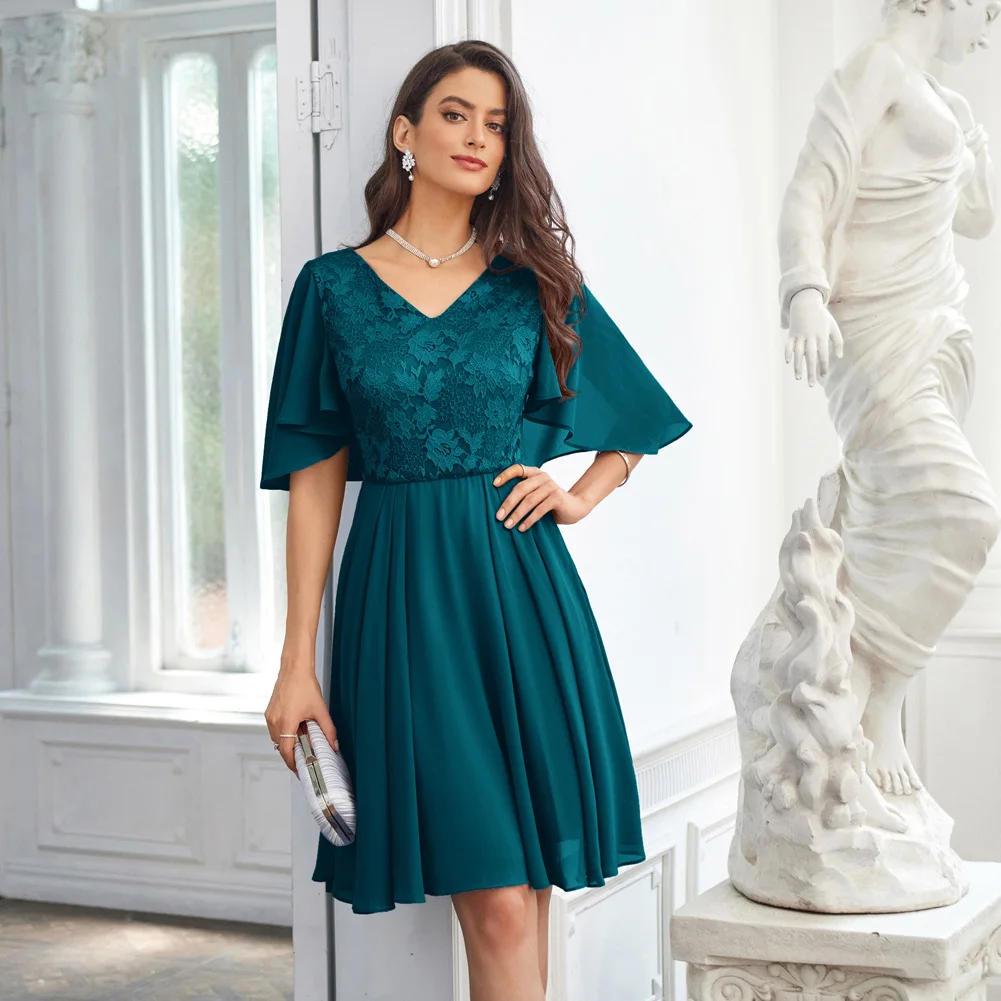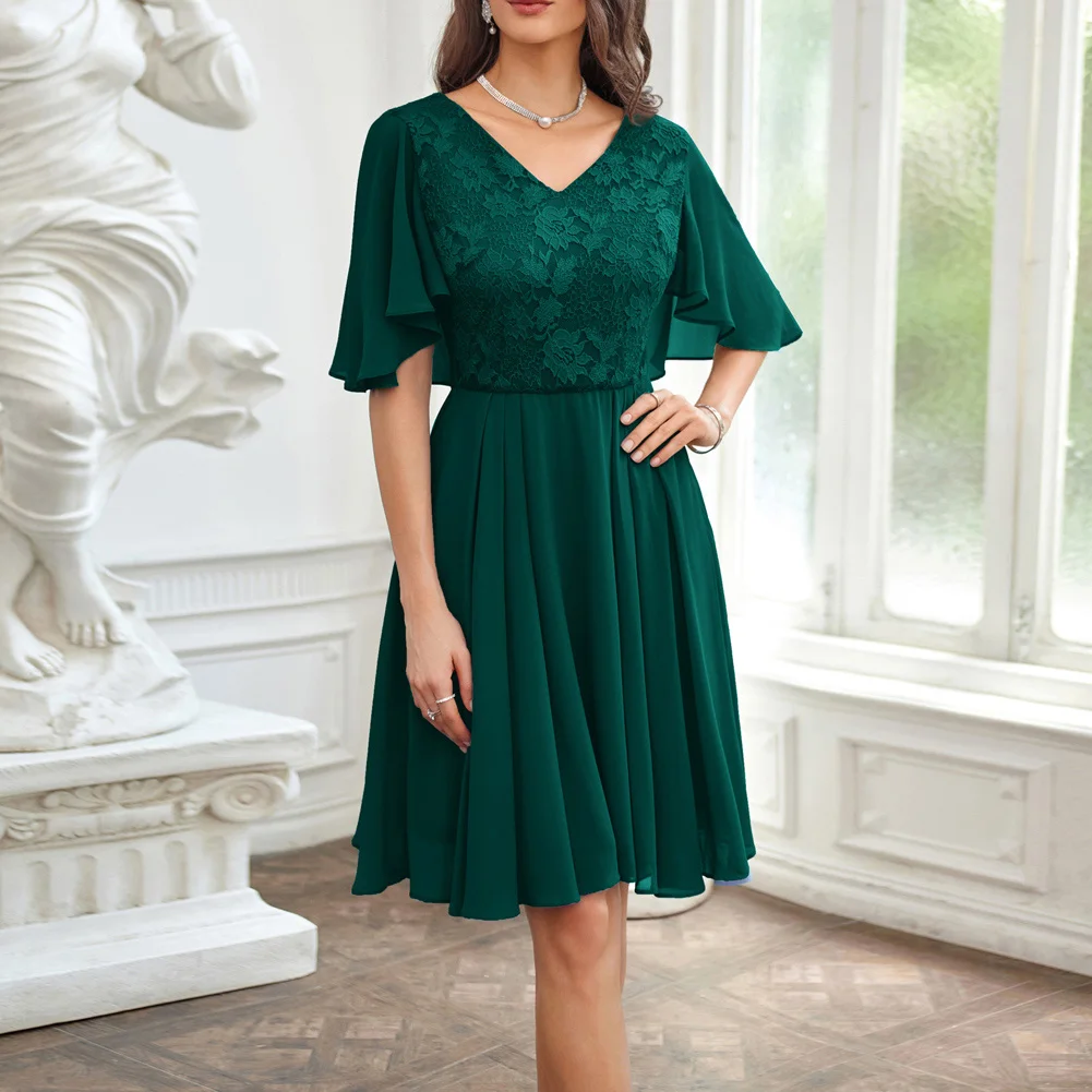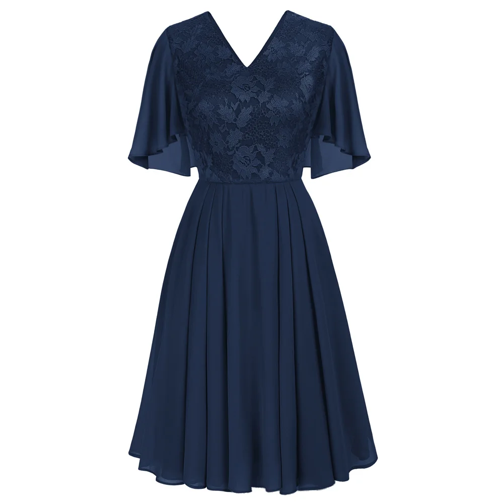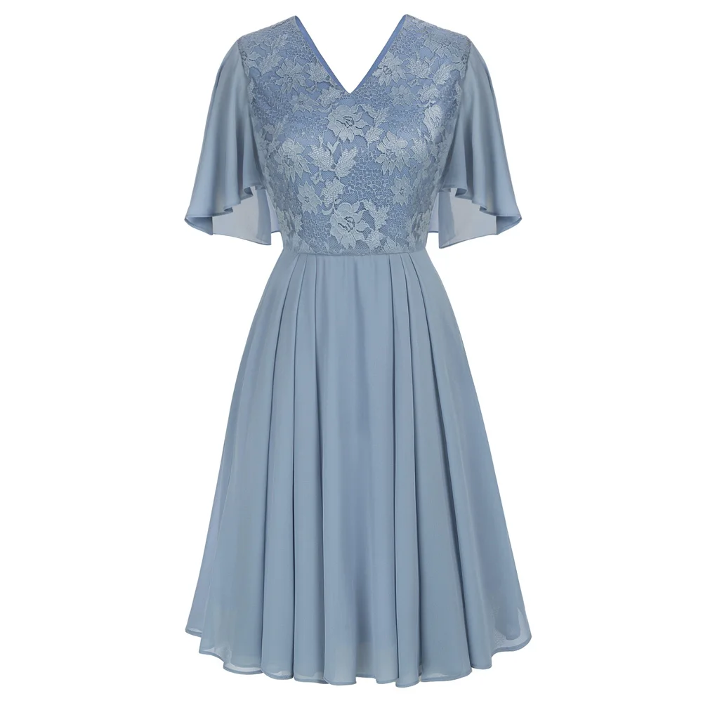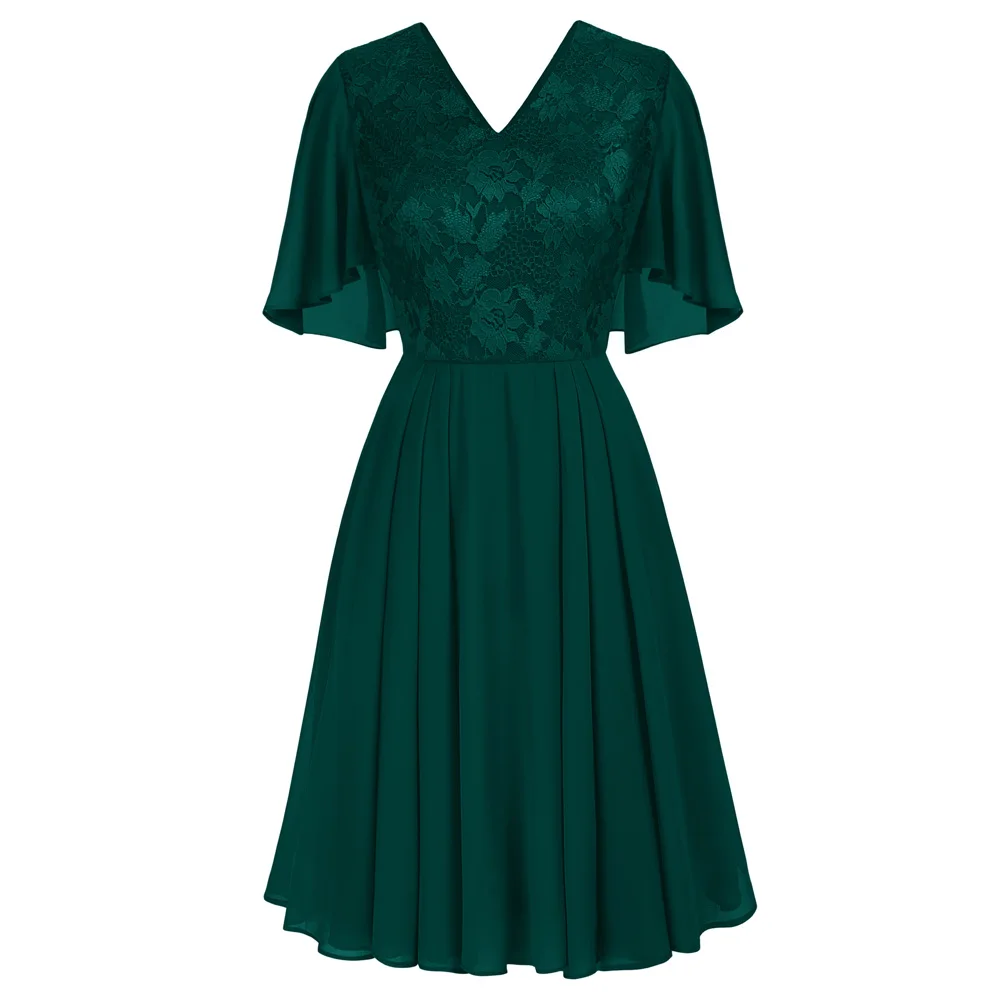 GK Women Lace Patchwork Dress Cape Sleeve V-Neck Flared A-Line Causal Fashion Party Evening Dresses Female Lady Elegant Gown