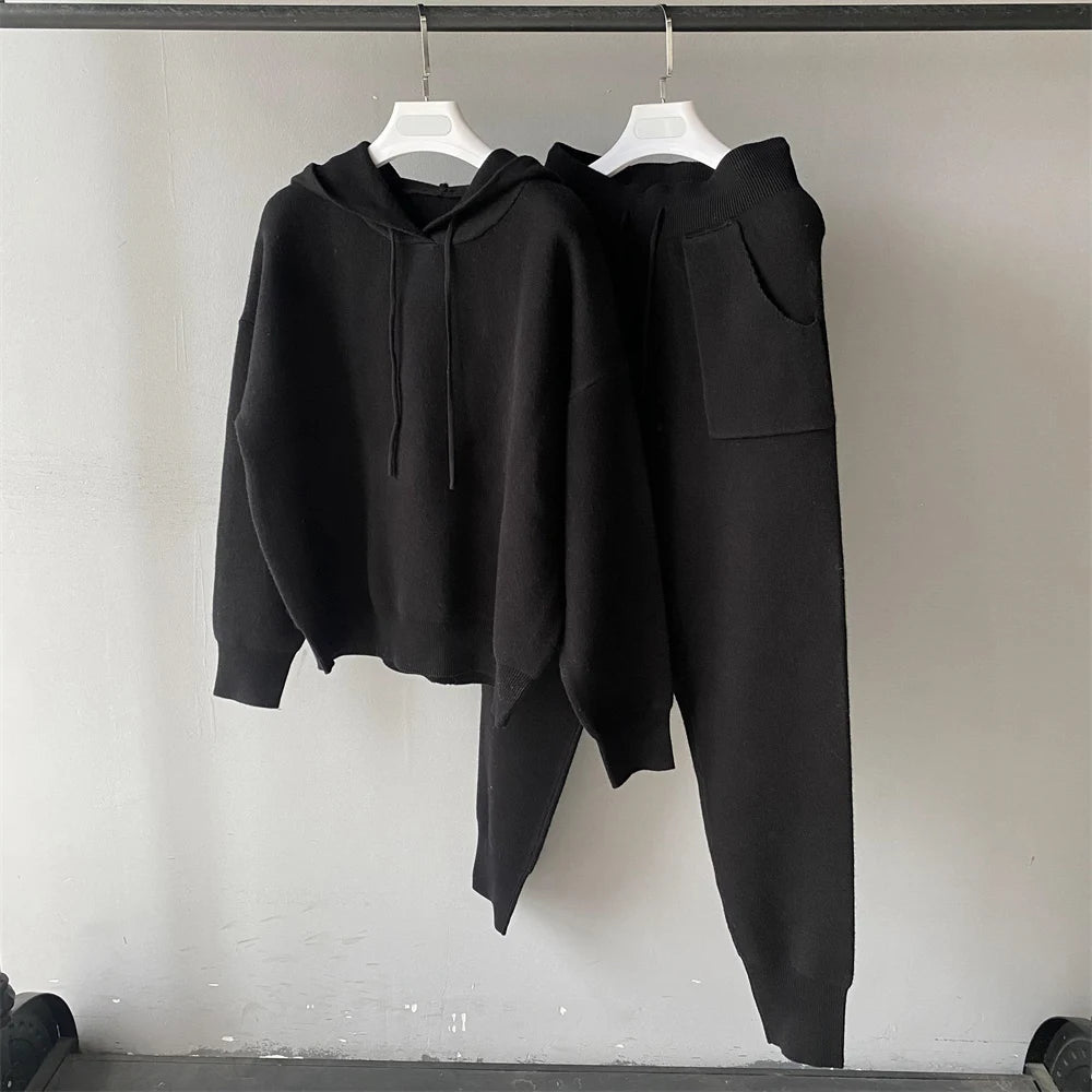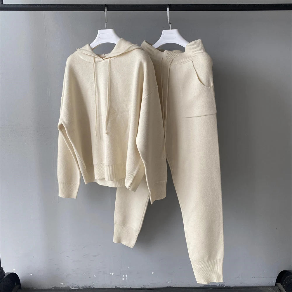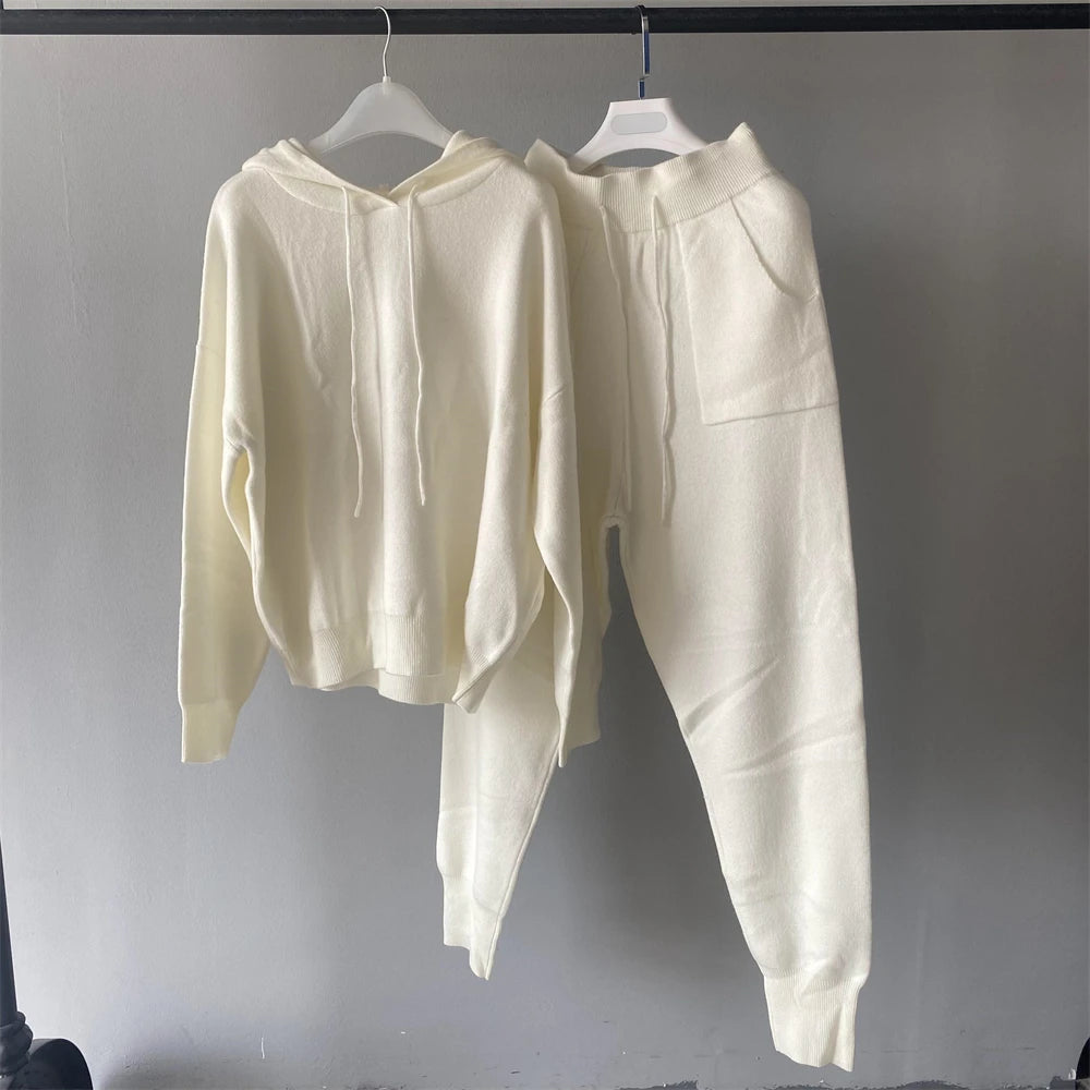 Jxwatcher Women's Sweater and Pant Sets With Real Fox Fur Collar Autumn Fashion Ladies Knitted Two Piece Set With Hooded Female