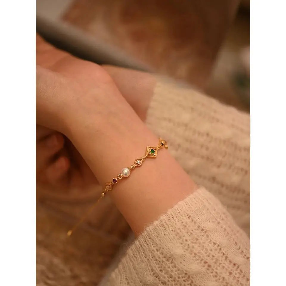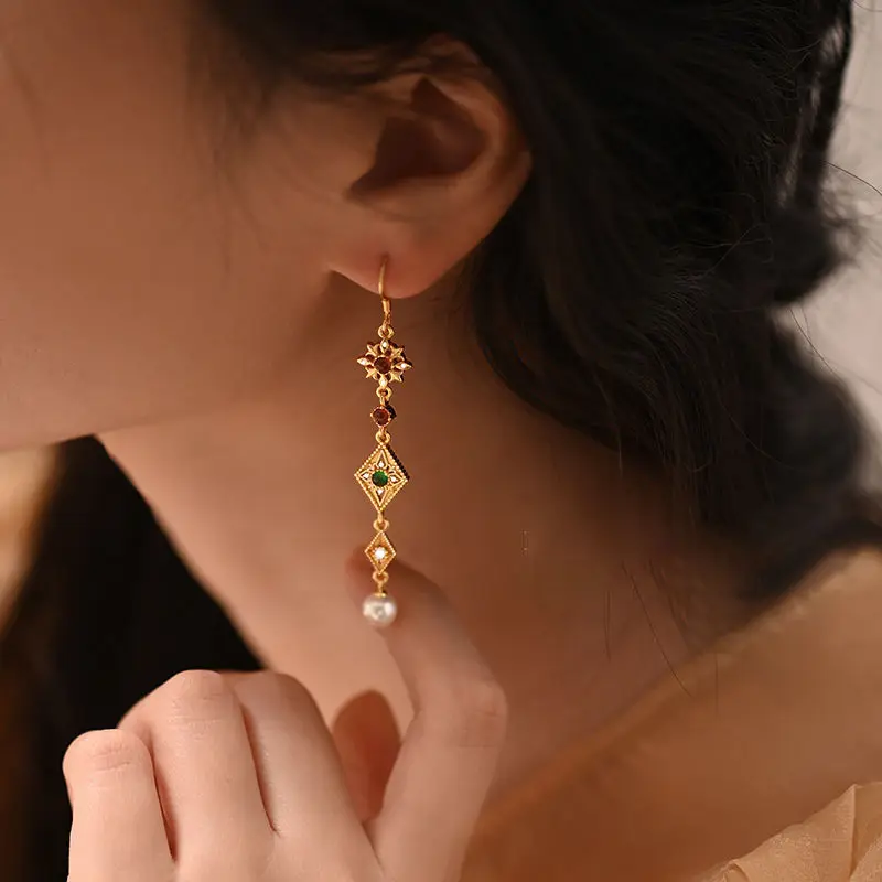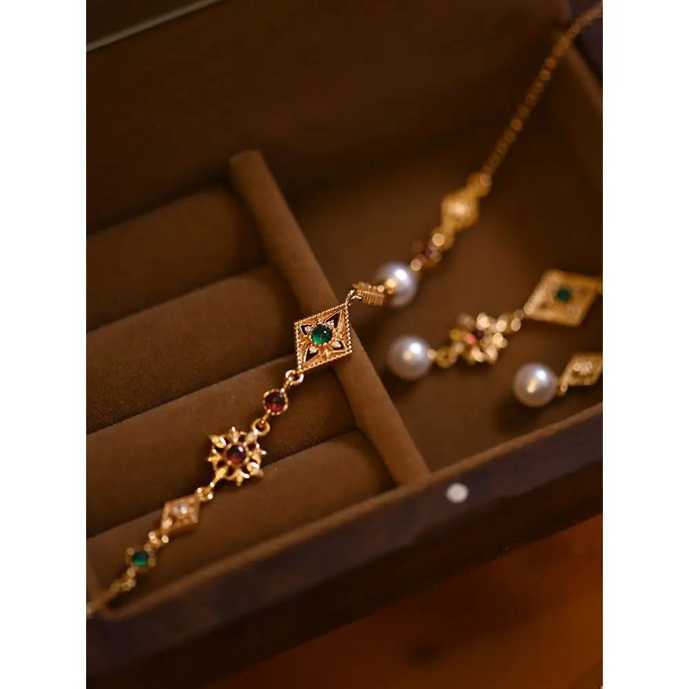 Luxury Designer Gemstone Ruby Emerald Pearl Ear Drop Dangle Tassel Earring 18K Gold Plated Chic Bracelet Jewelry Set For Women