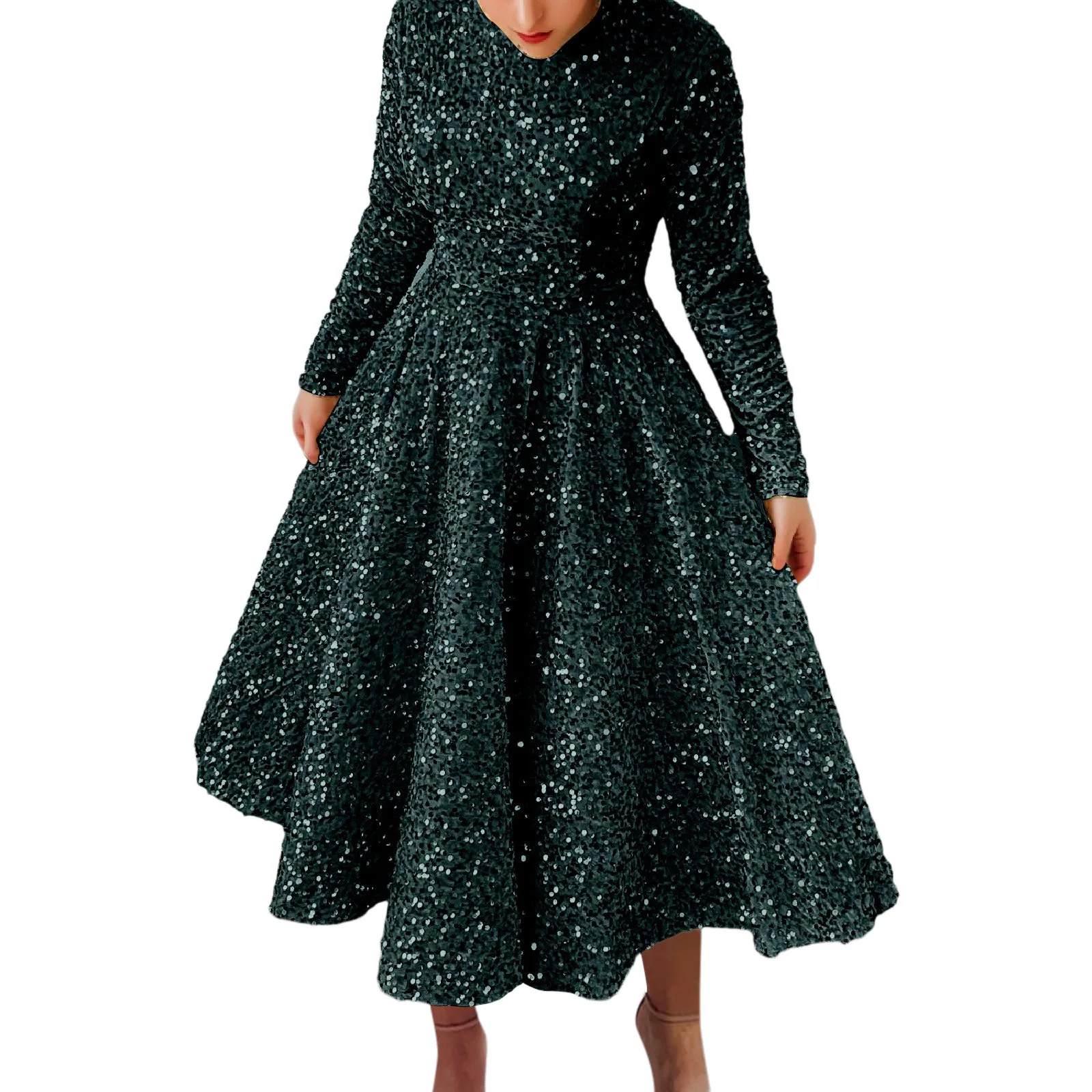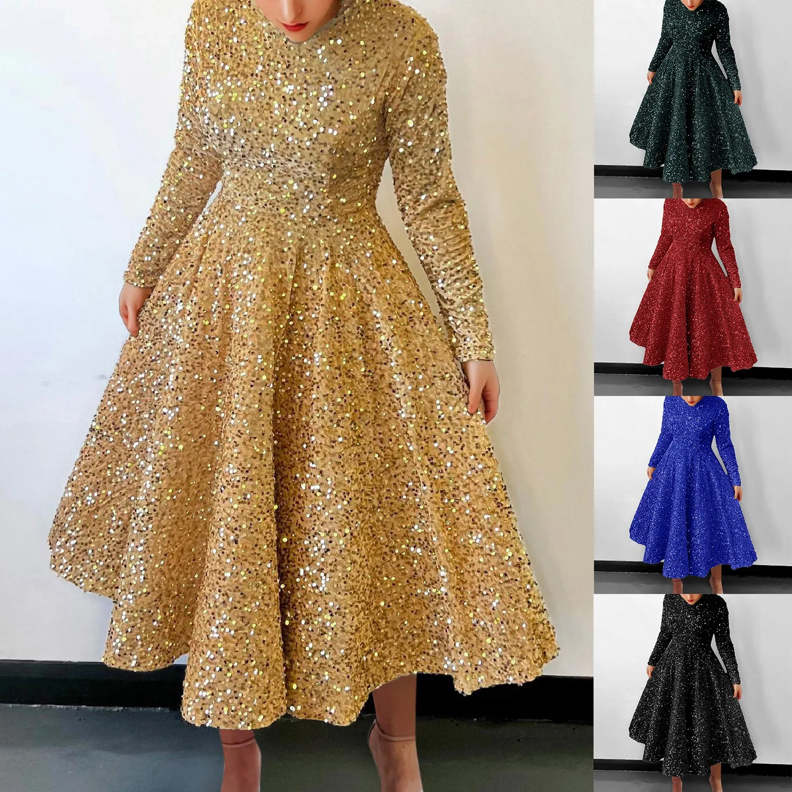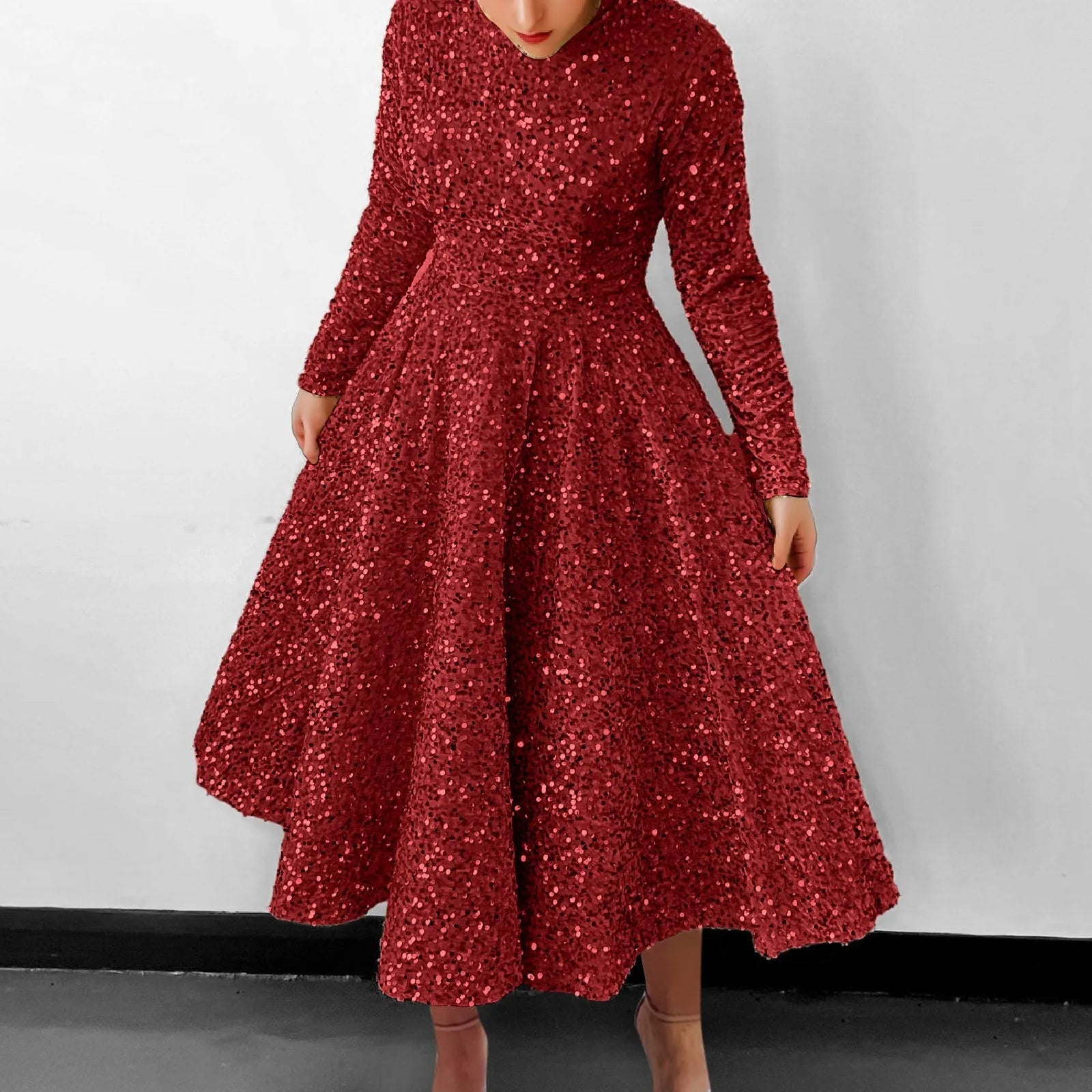 sequin dress Long skirt Women's dress round neck Long sleeve velvet sparkly pleated cocktail dress