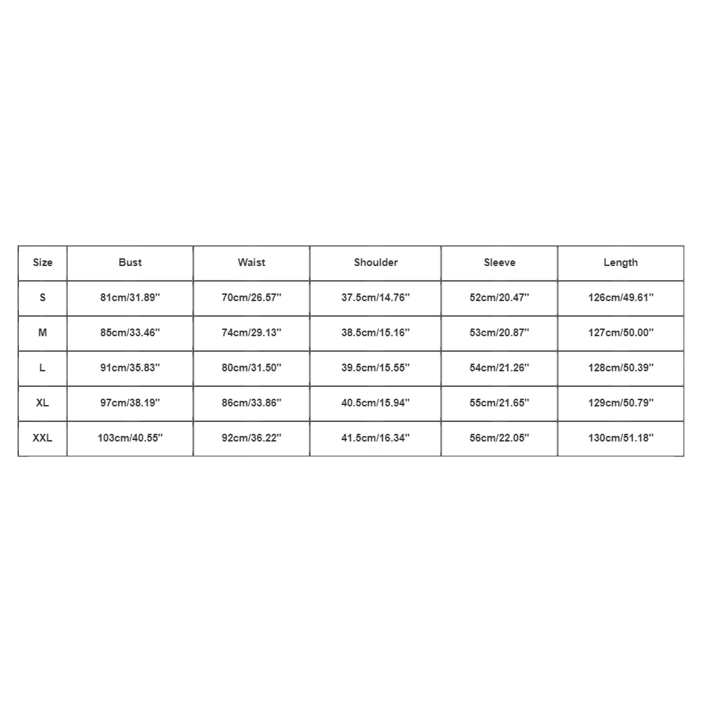| Size:L | Bust :91cm/35.83'' | Waist:80cm/31.50'' | Shoulder:39.5cm/15.55'' | Sleeve:54cm/21.26'' | Length:128cm/50.39'' |