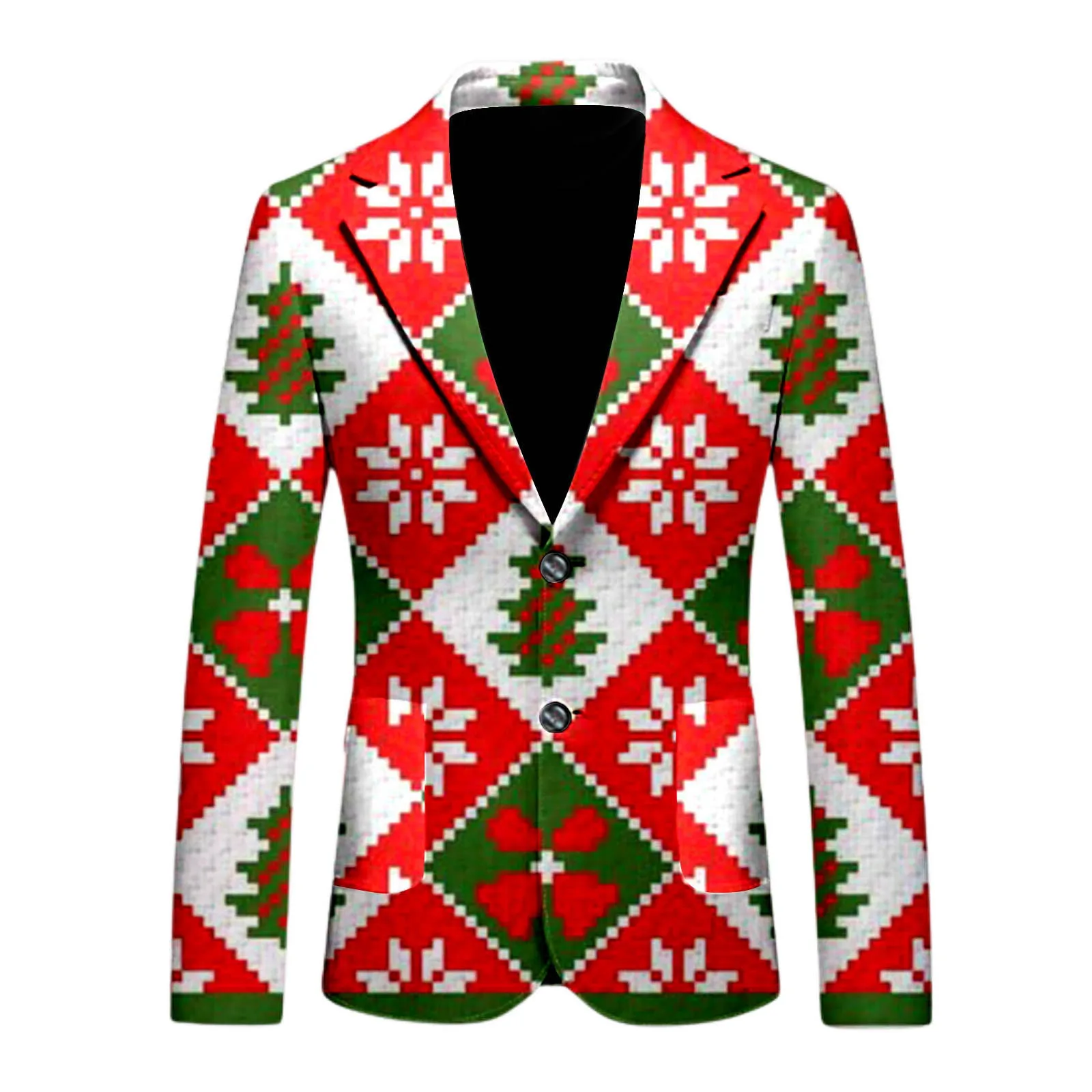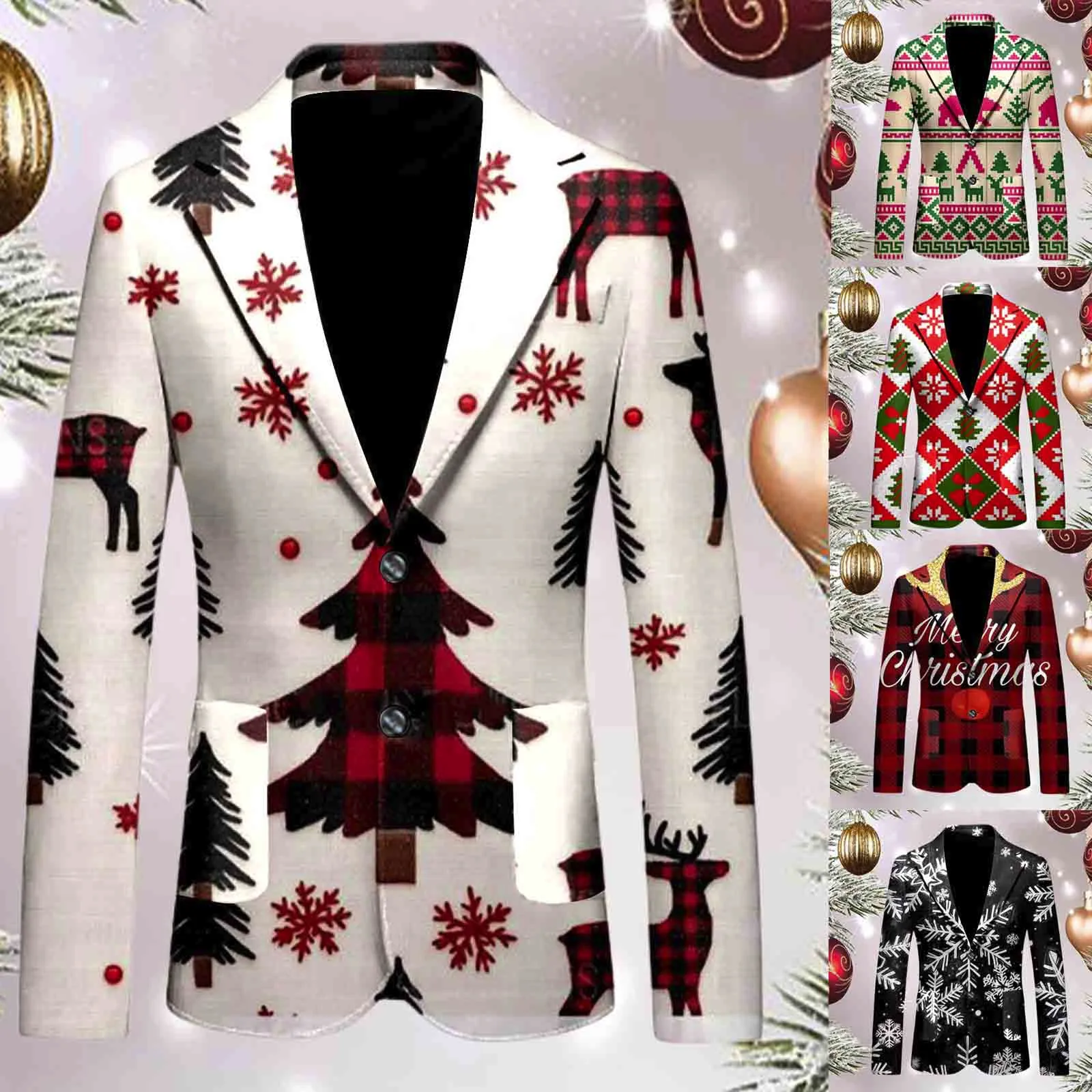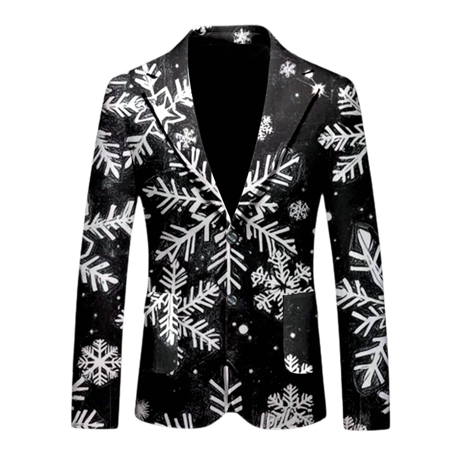 Men's Christmas Snowflake Elk Print Blazer Jackets With Pocket Elegant Slim One Button Suit Coat Plus Size Party Outwears