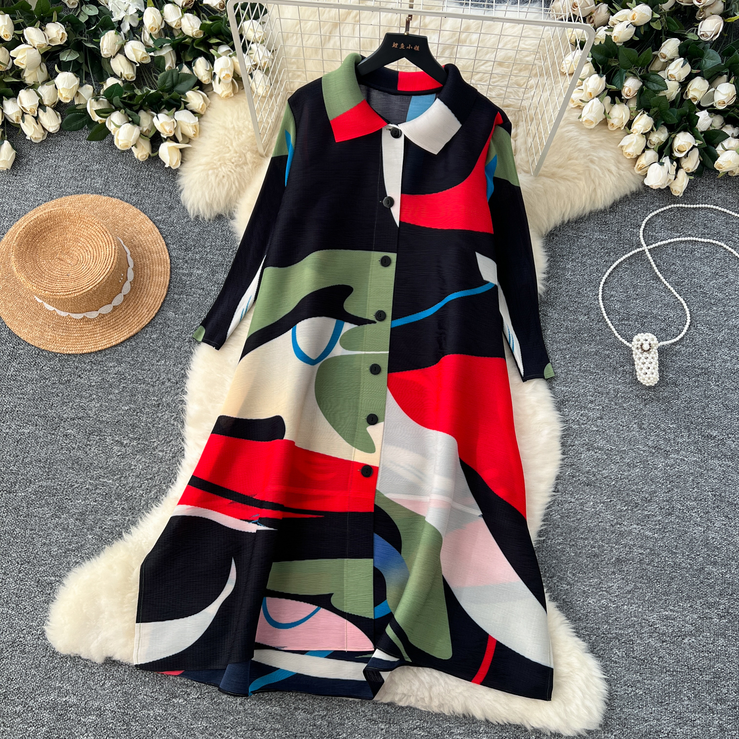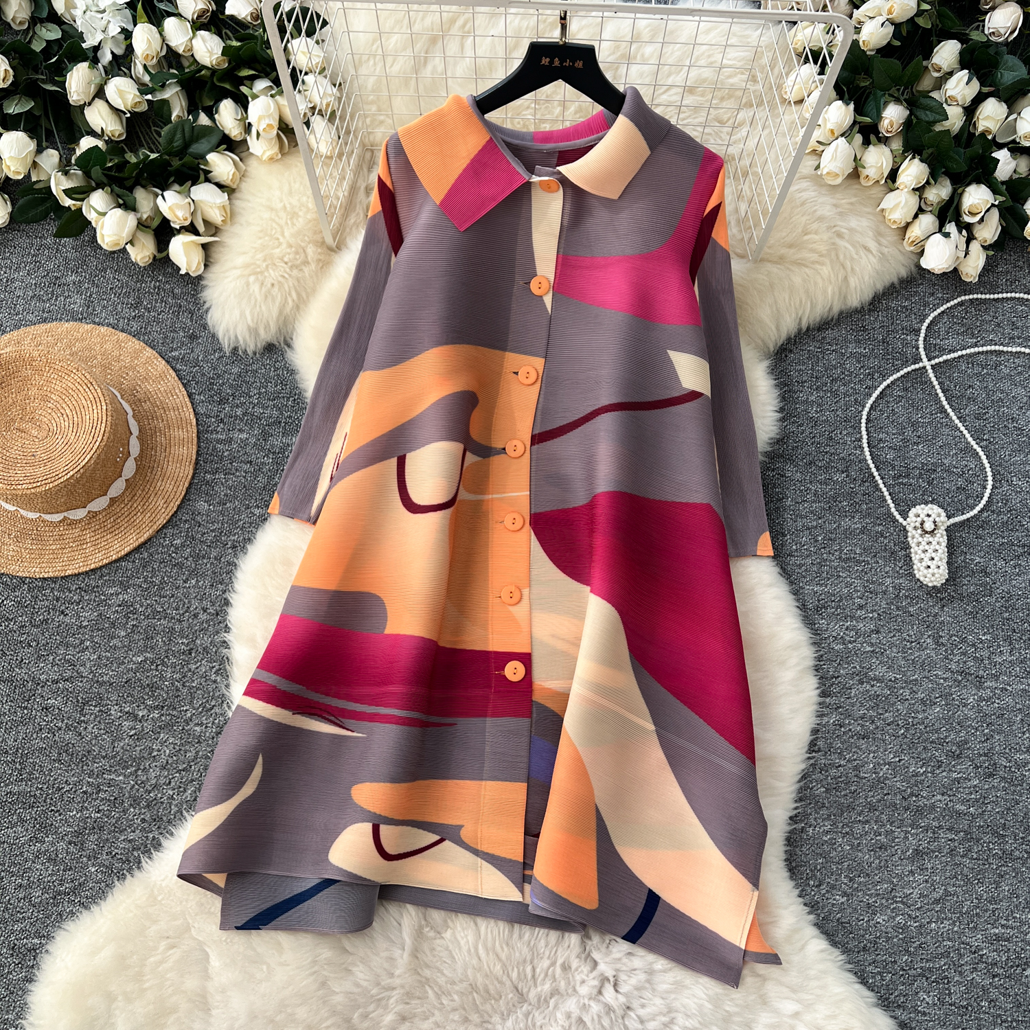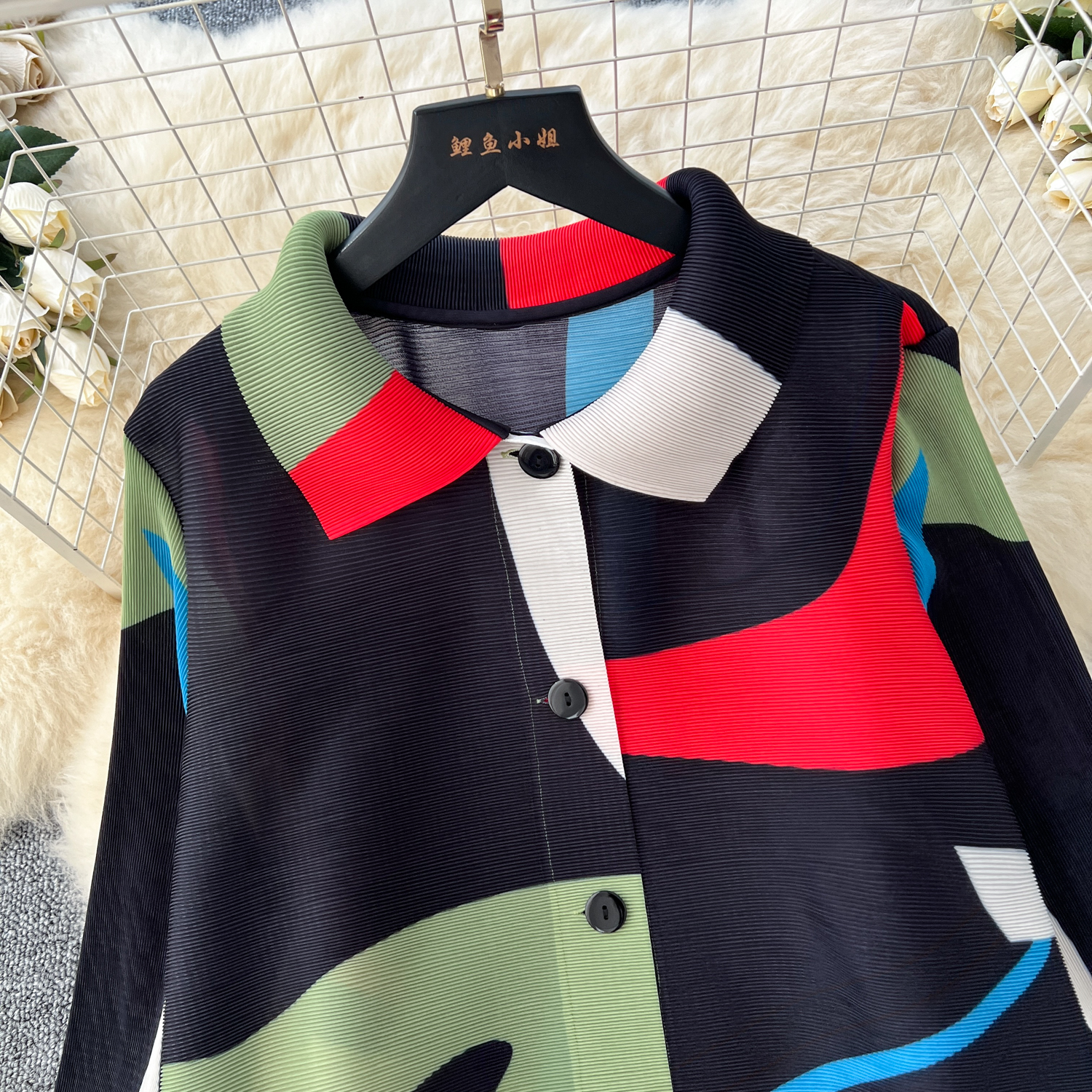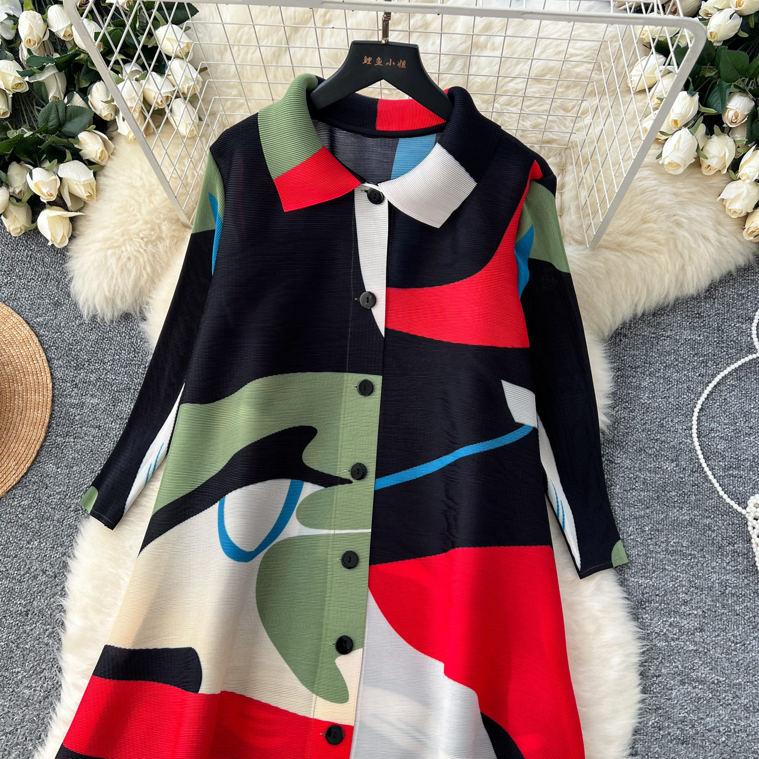 Miyake Pleated Large Size Shirt Dress Women's 2024 Autumn New Colorblock Print Stand Collar Loose Fat MM Slim Stretch Cardigans