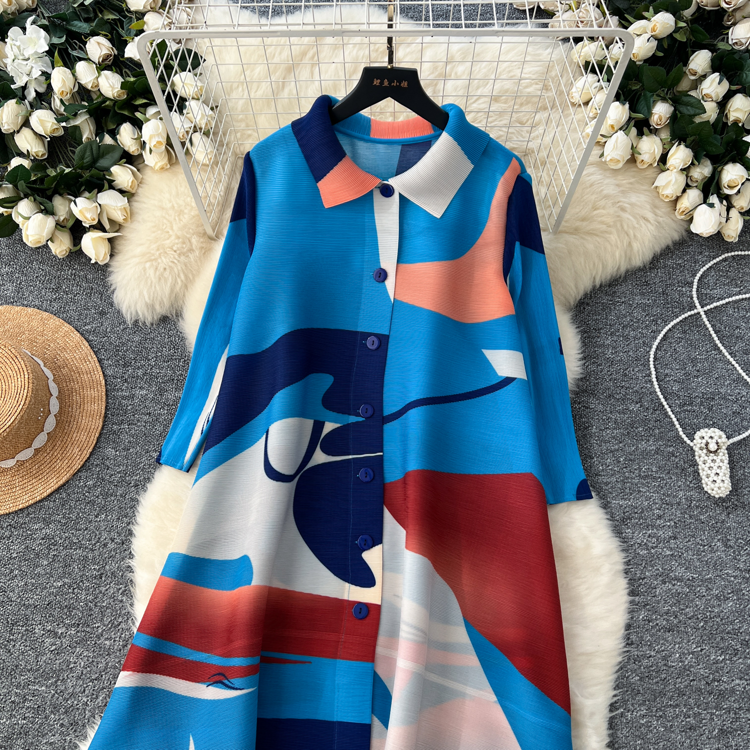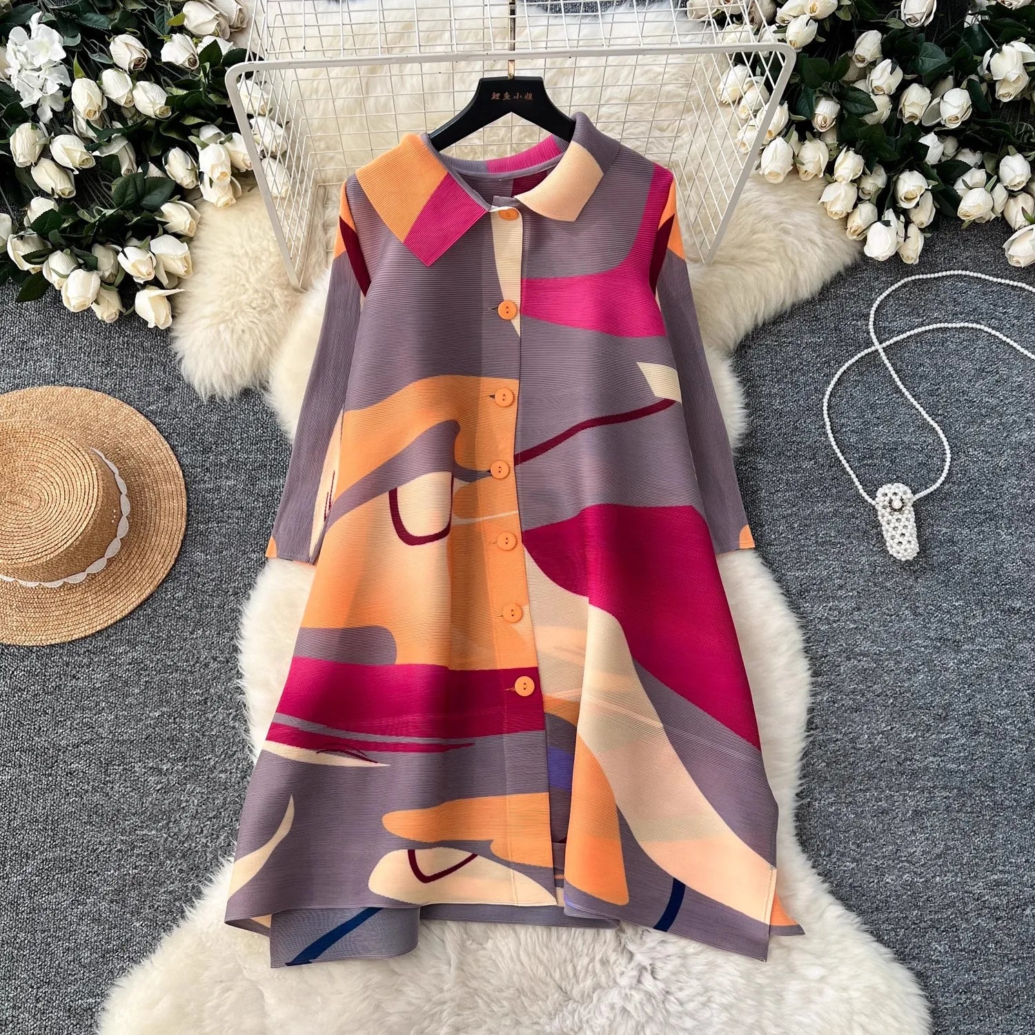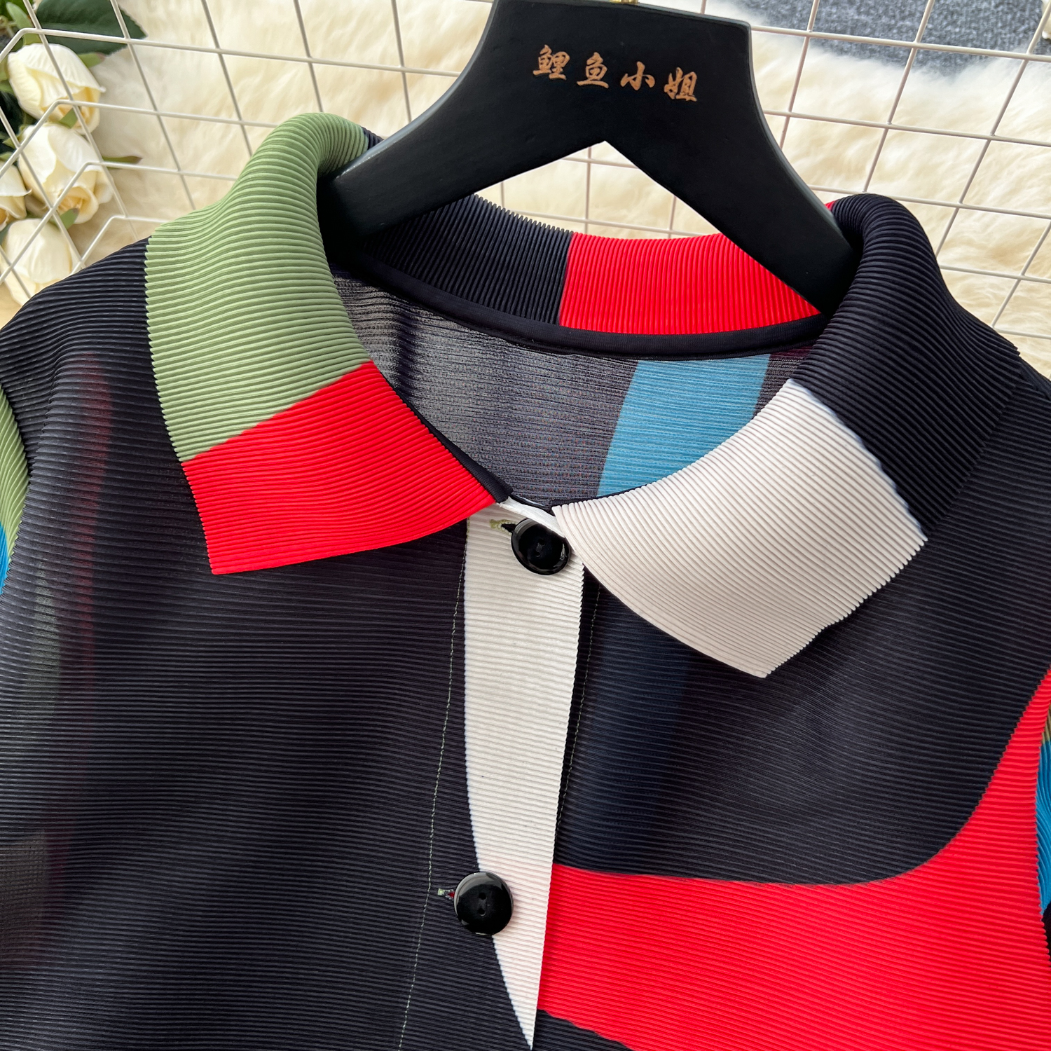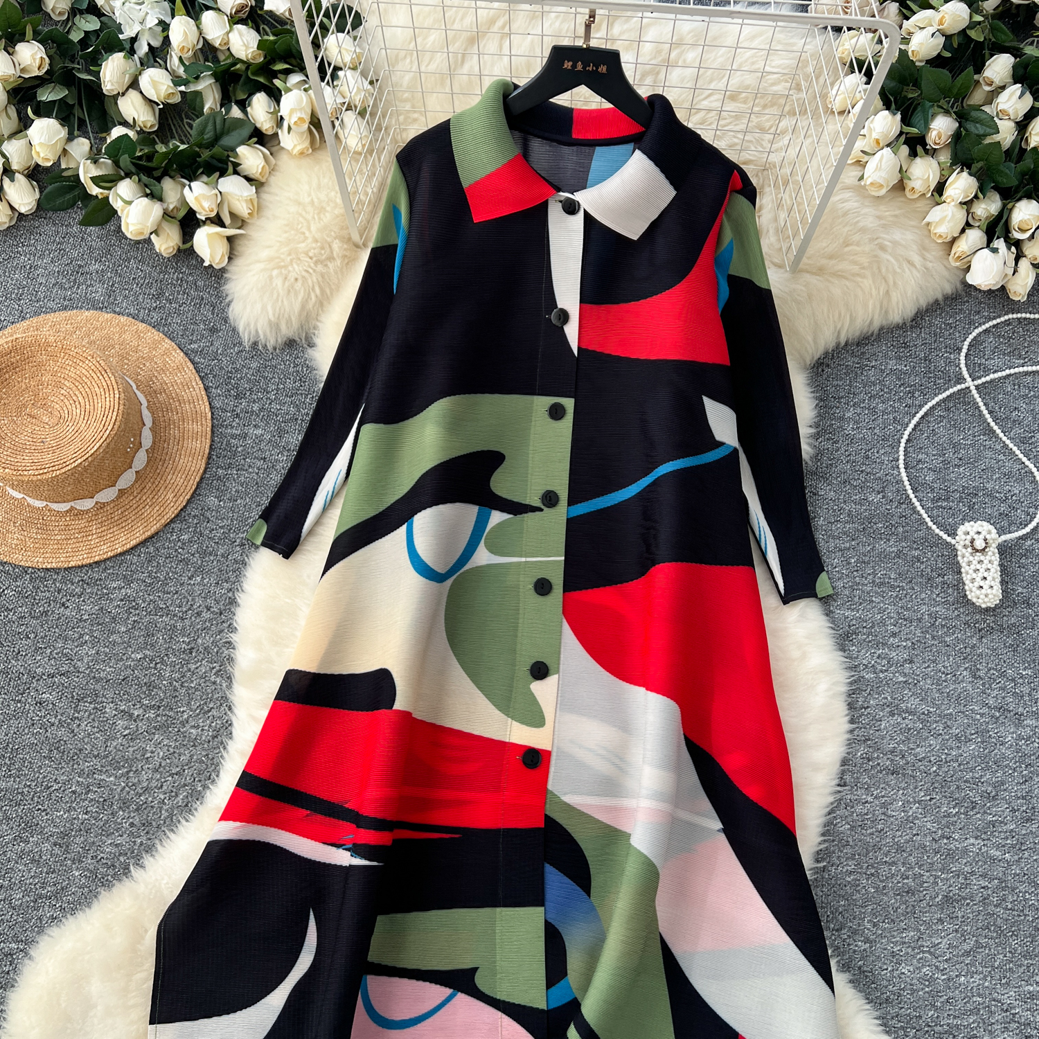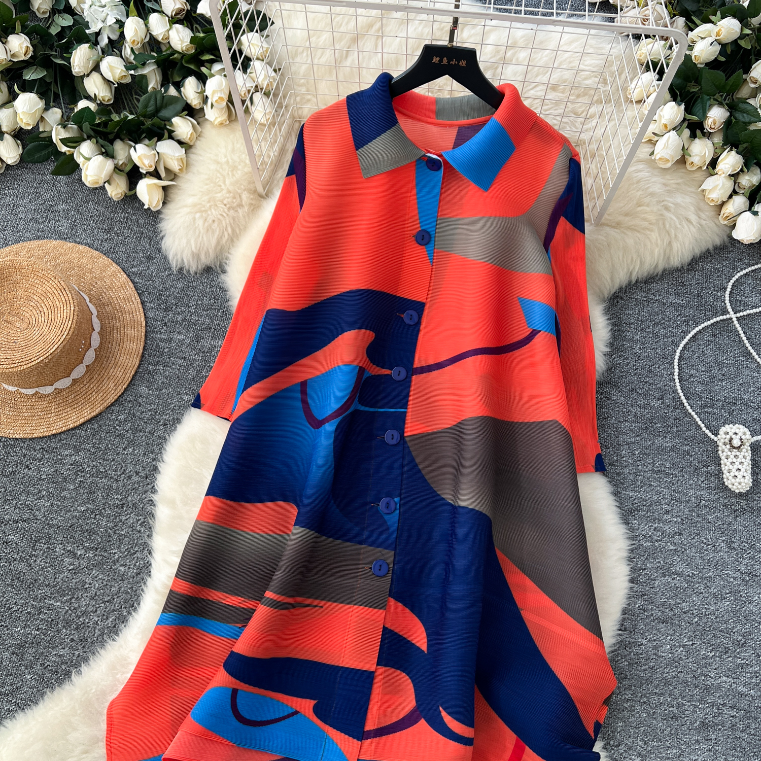 Miyake Pleated Large Size Shirt Dress Women's 2024 Autumn New Colorblock Print Stand Collar Loose Fat MM Slim Stretch Cardigans