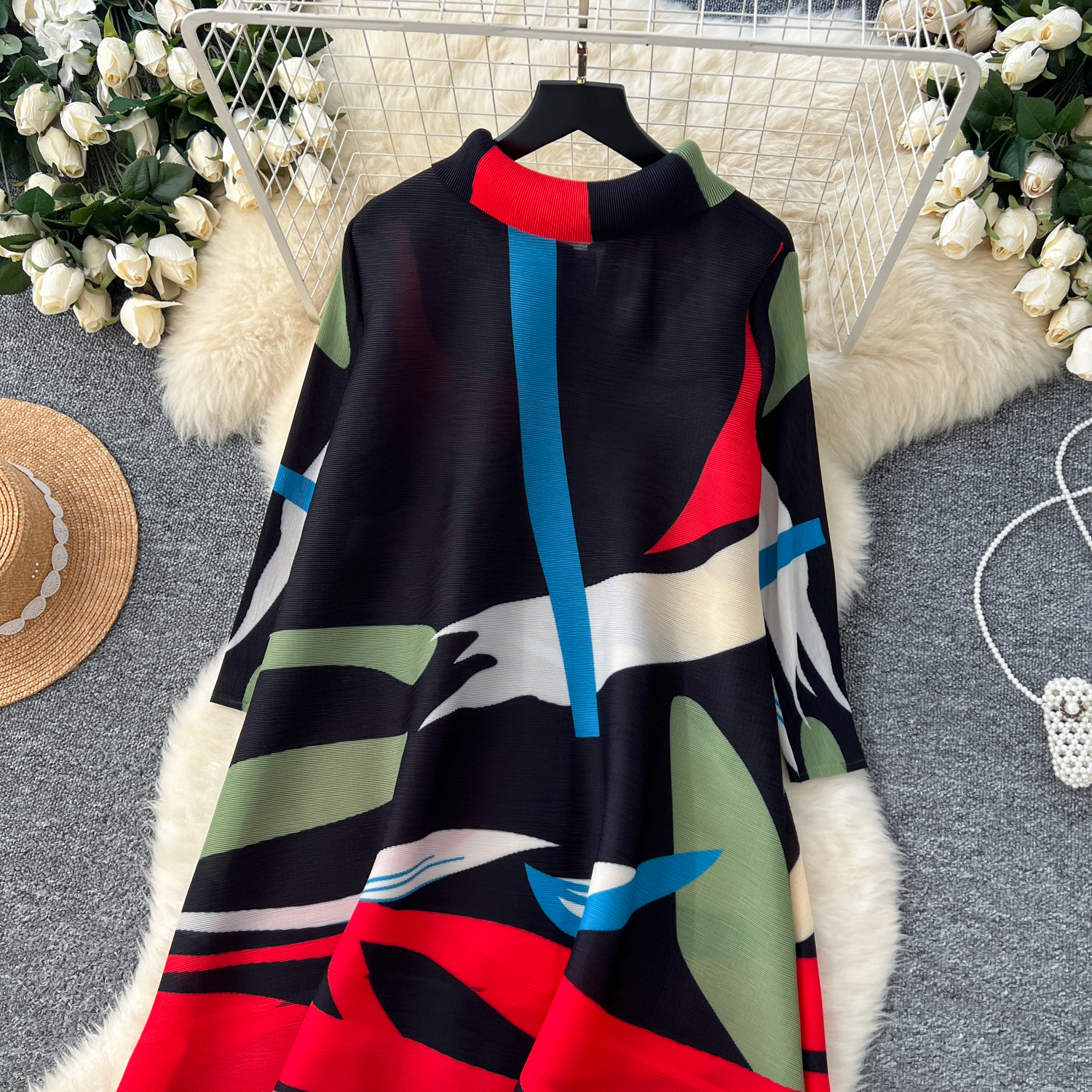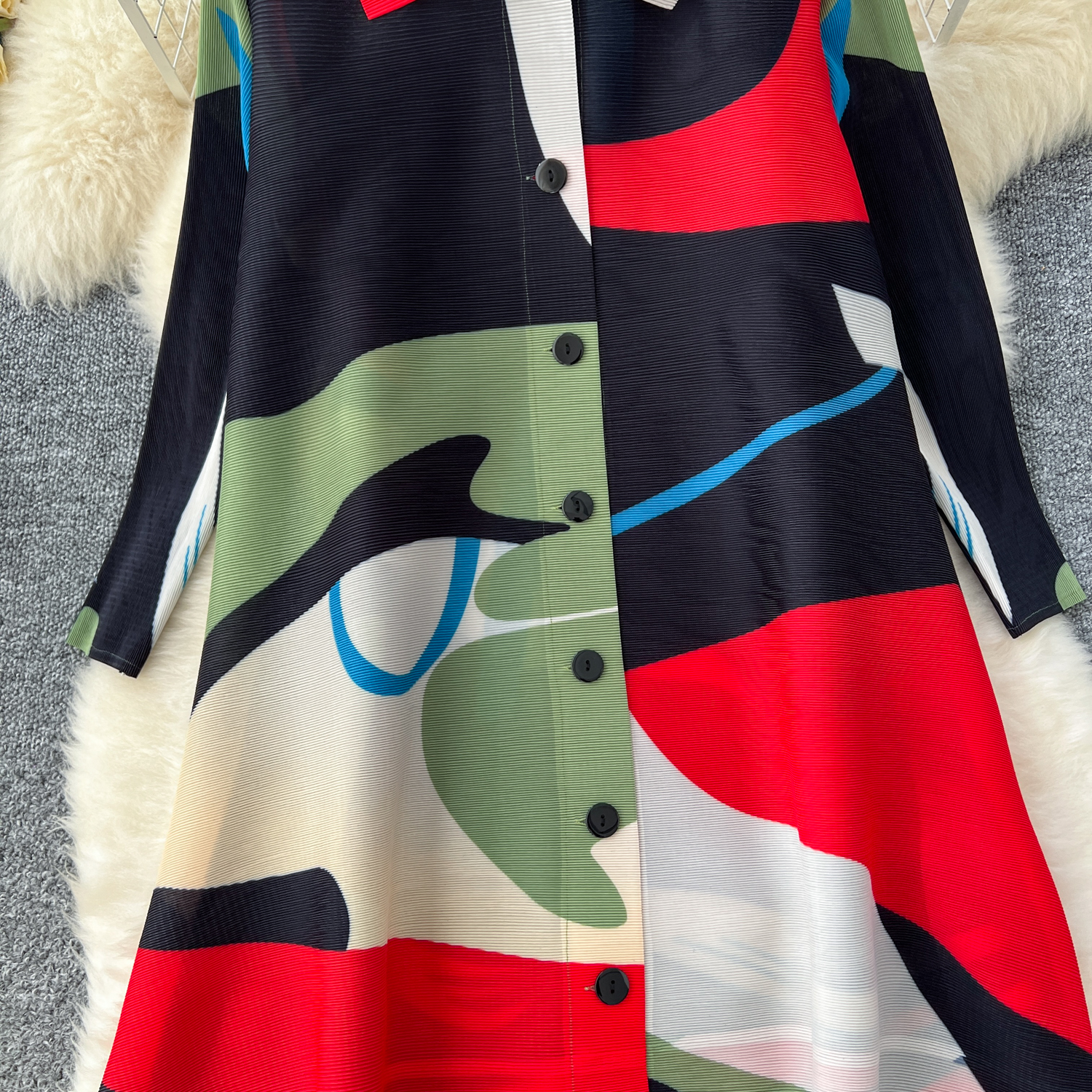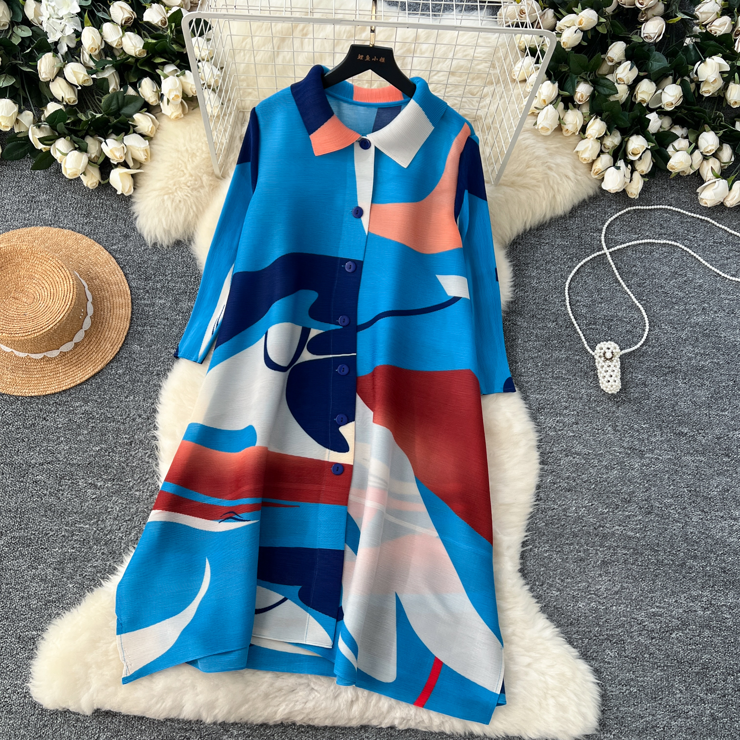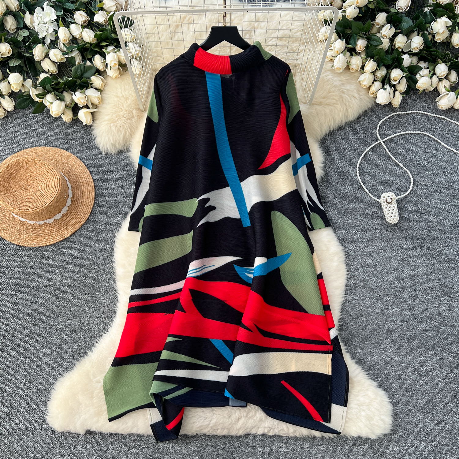 Miyake Pleated Large Size Shirt Dress Women's 2024 Autumn New Colorblock Print Stand Collar Loose Fat MM Slim Stretch Cardigans
