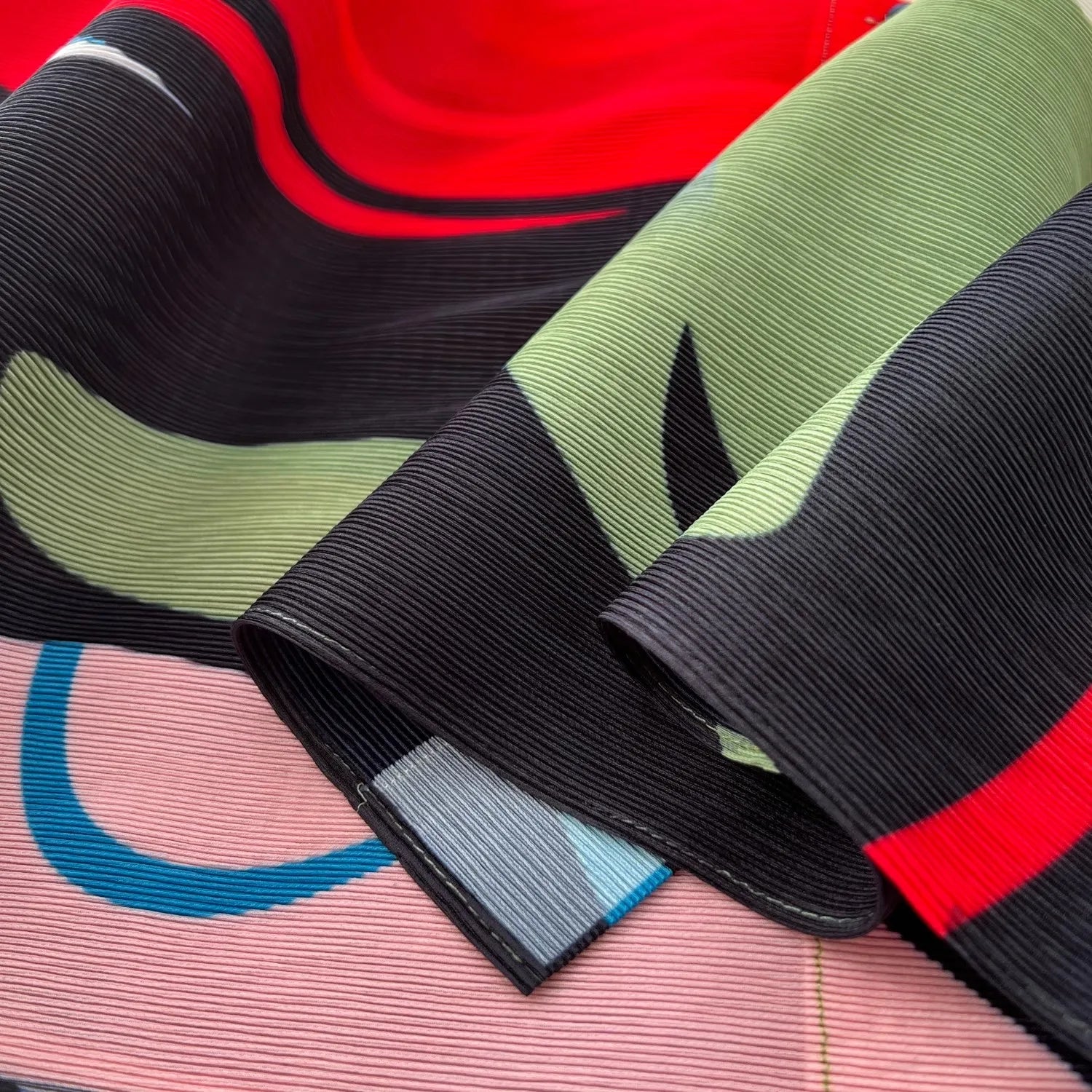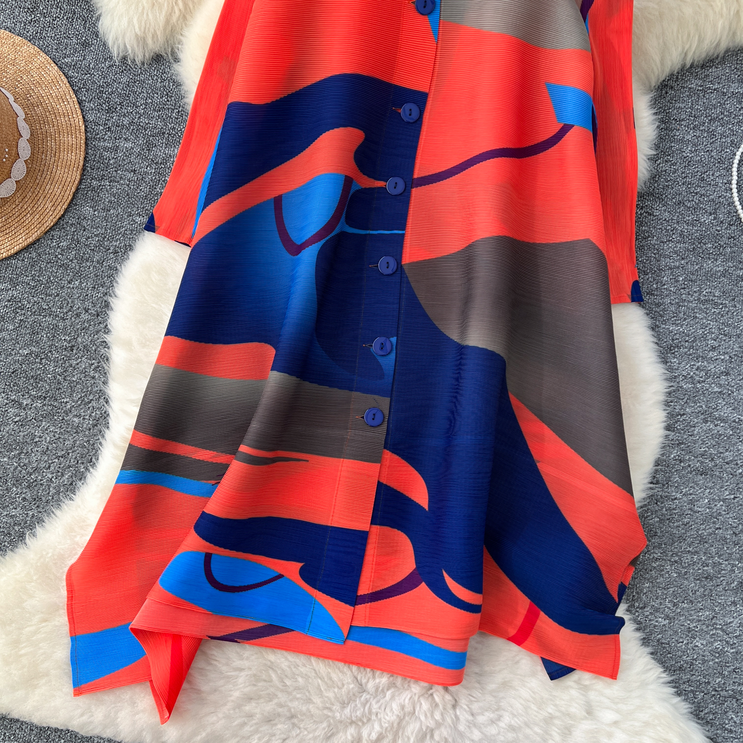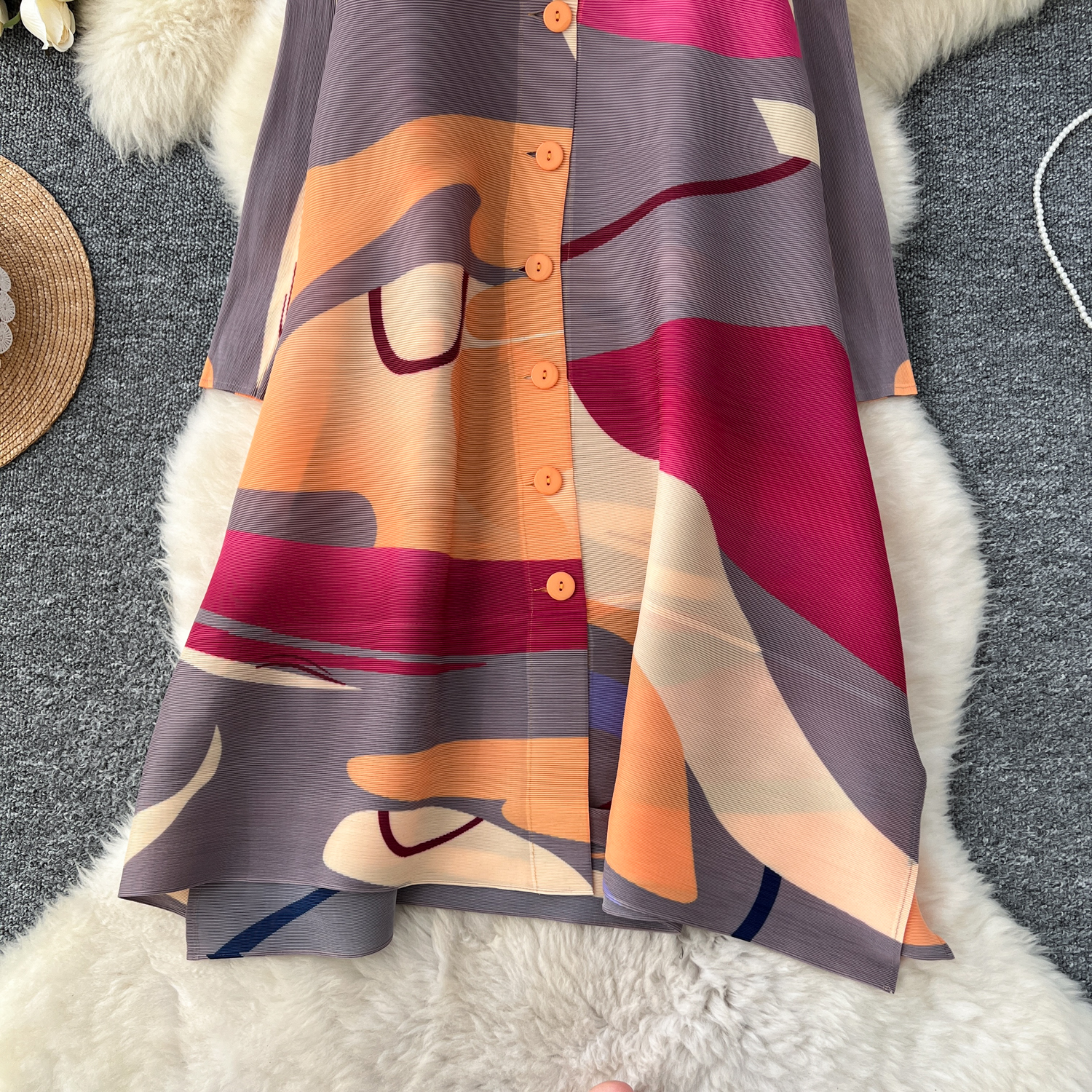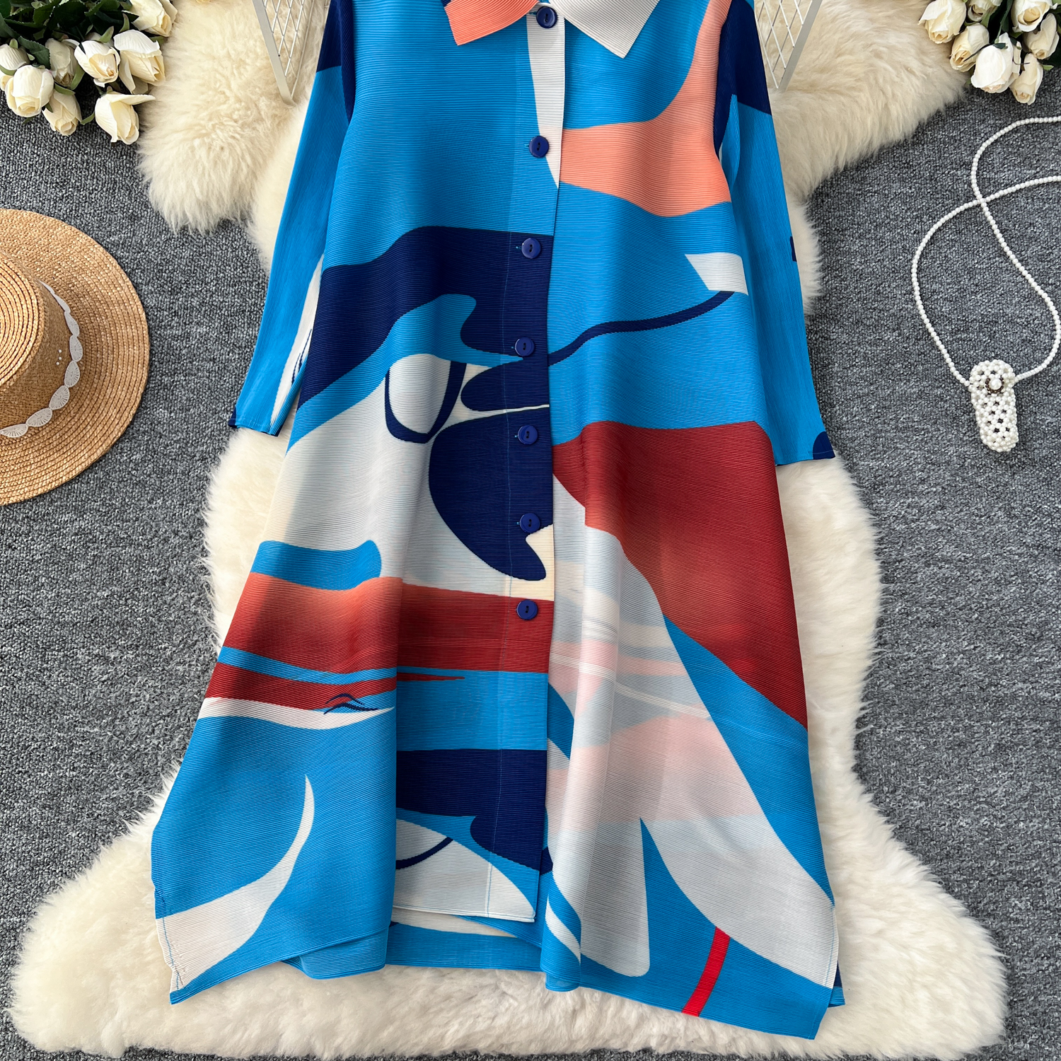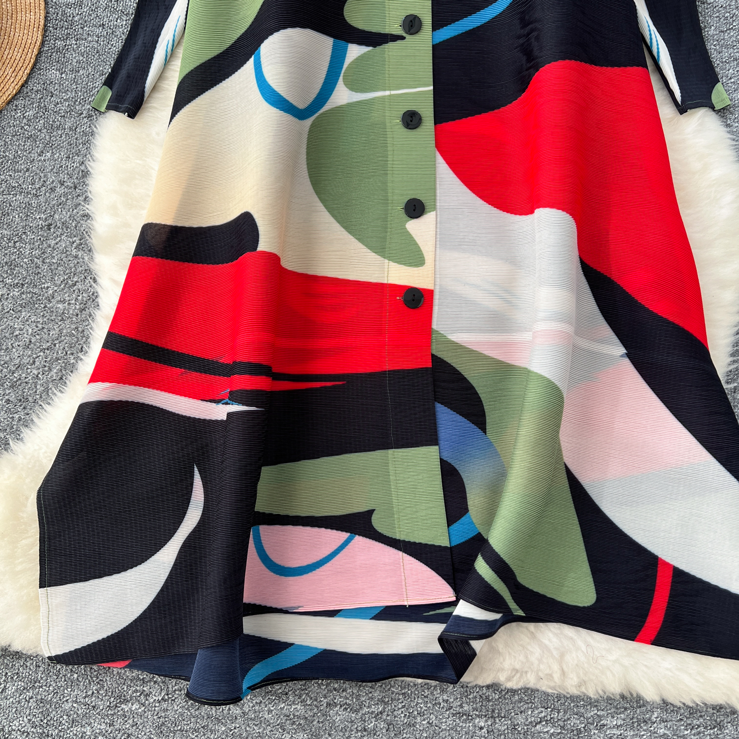 Miyake Pleated Large Size Shirt Dress Women's 2024 Autumn New Colorblock Print Stand Collar Loose Fat MM Slim Stretch Cardigans
