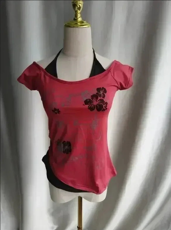 Neploe American Vintage Fake Two Piece Halter Lace Up T-shirts Y2k Slim Fit Print Tops Women Off Shoulder Short Sleeve Tee Shirt