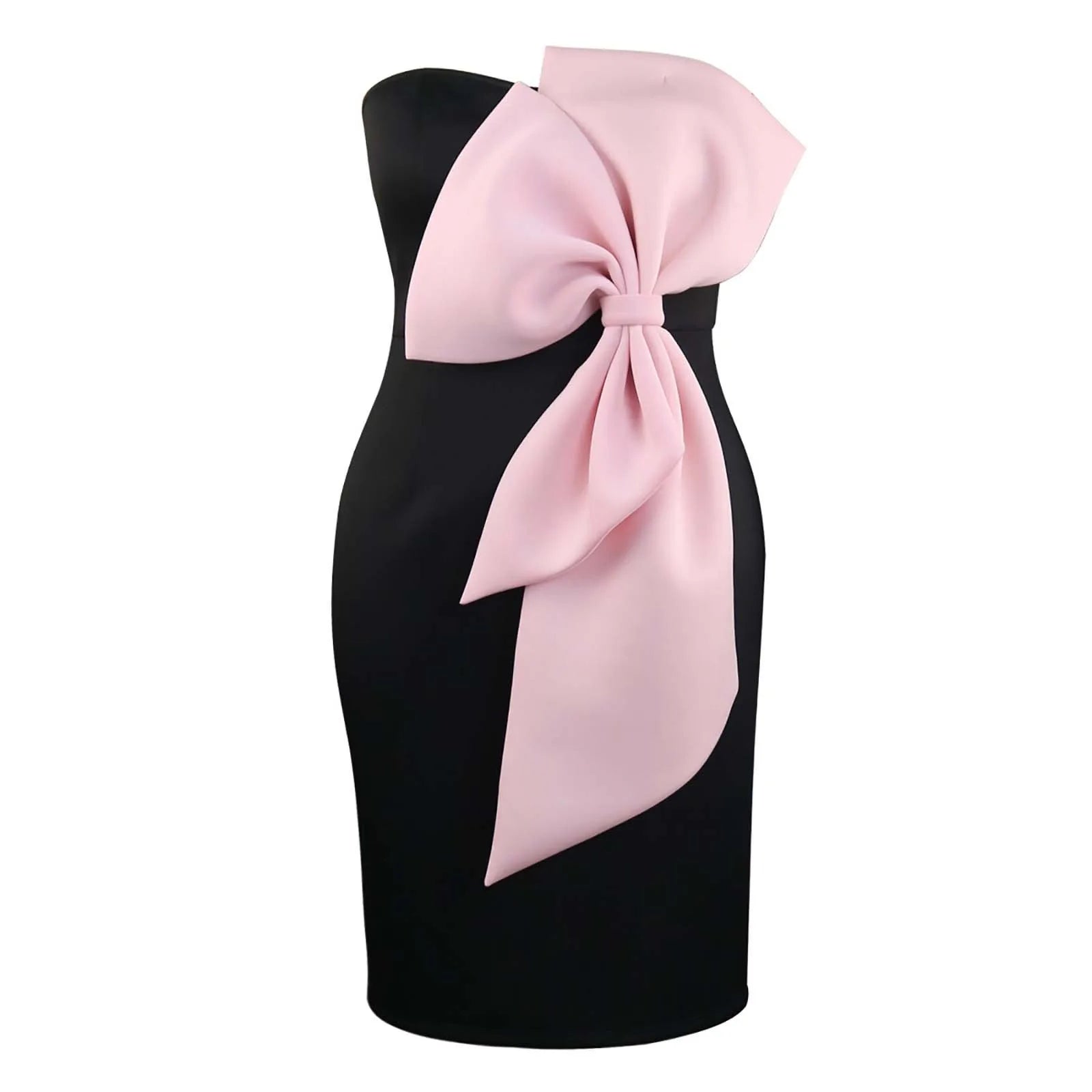 Party Formal Dresses Women Tube Top Black Pink Big Bow Patchwork Bodycon High Waist Evening Club Event Midi Gown Plus Size