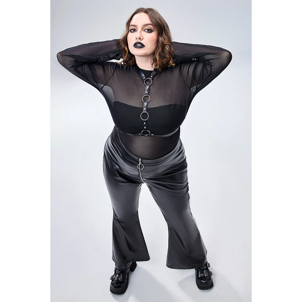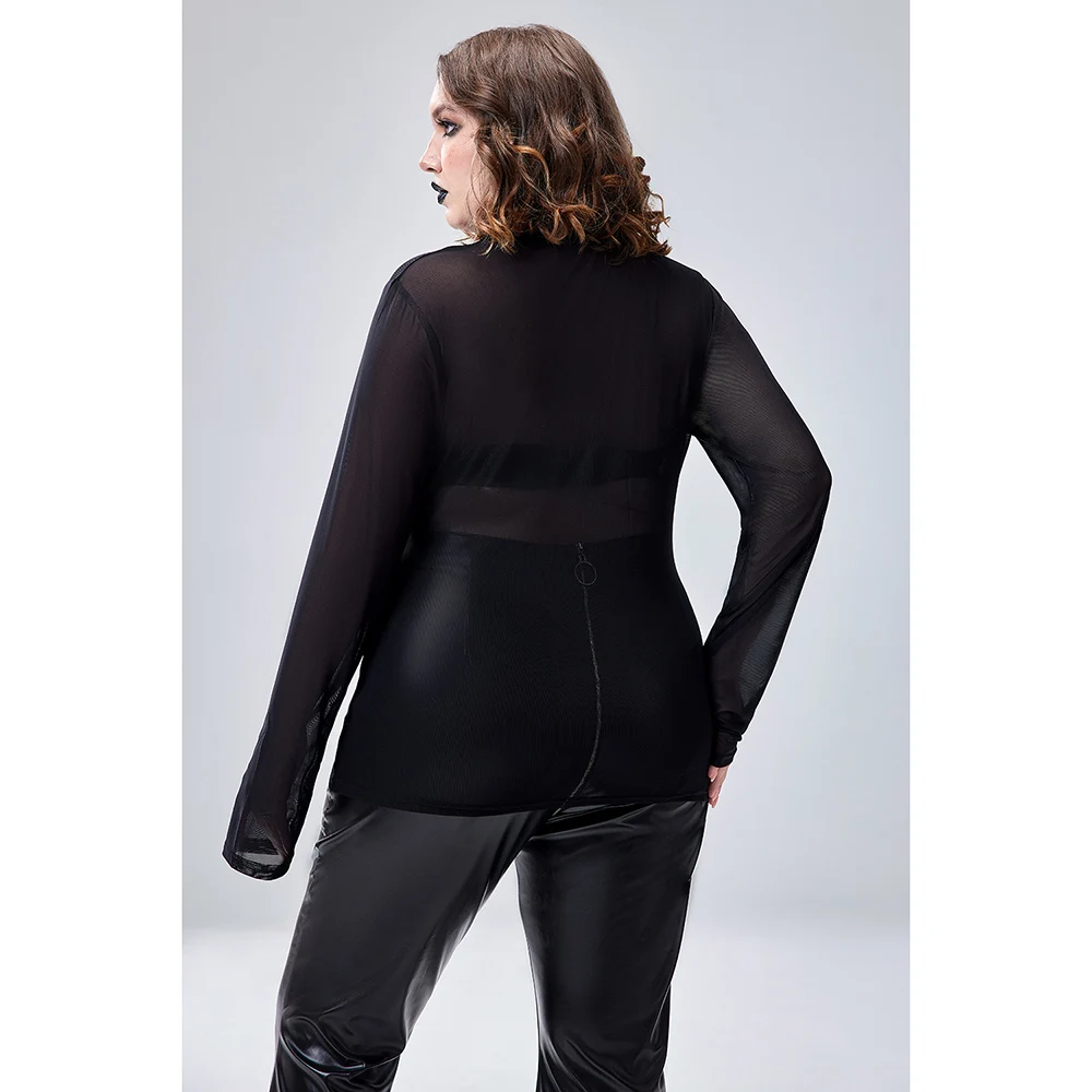 Plus Size Halloween Costume Gothic Black Round Neck Mesh See-Through Long Sleeve Blouse