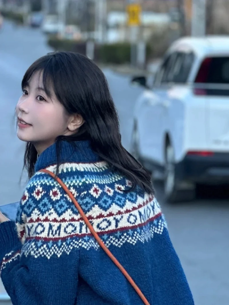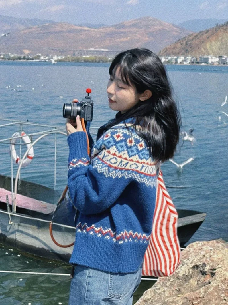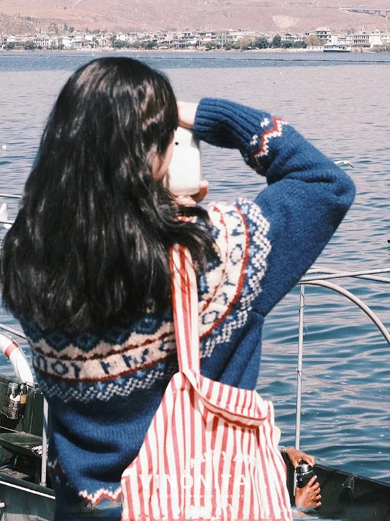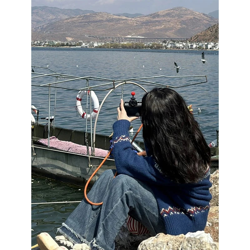 Vintage Print Knitted Cardigan Women Japanese Harajuku Sweater Outerwear Winter Aesthetic Long Sleeve Jumpers Korean Knitwear