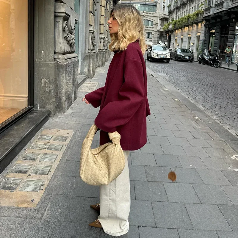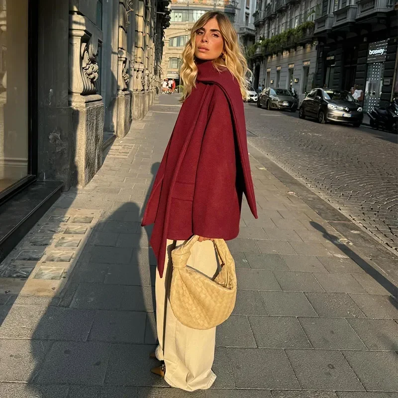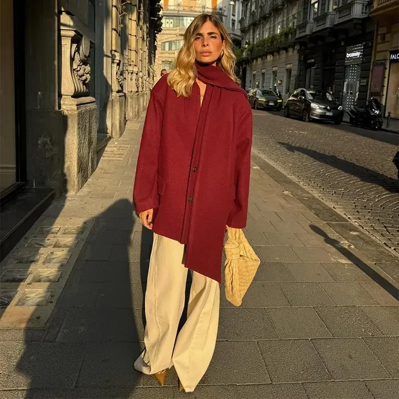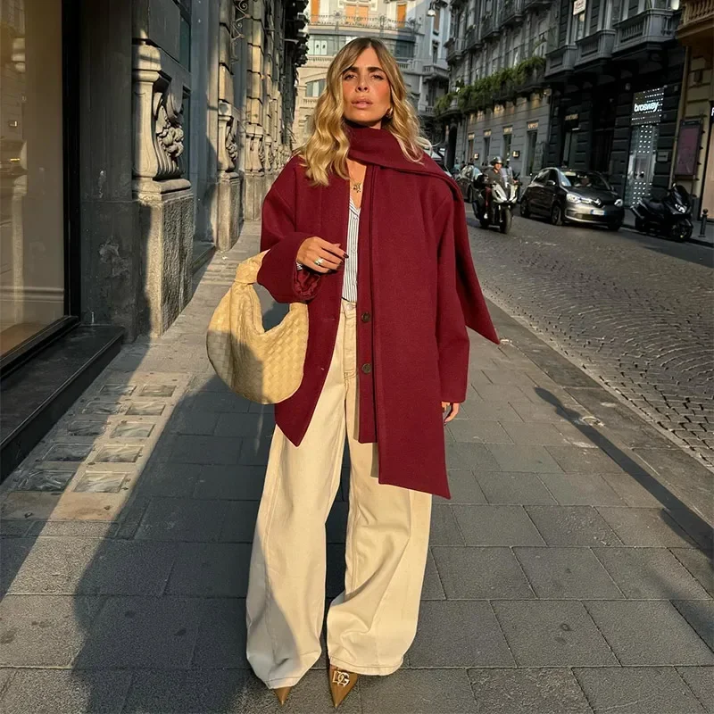Vintage Women's Woolen Coat With Scarf Loose V-neck Single Breasted Full Sleeve Female Jackets 2024 Autumn Lady Fashion Outwear