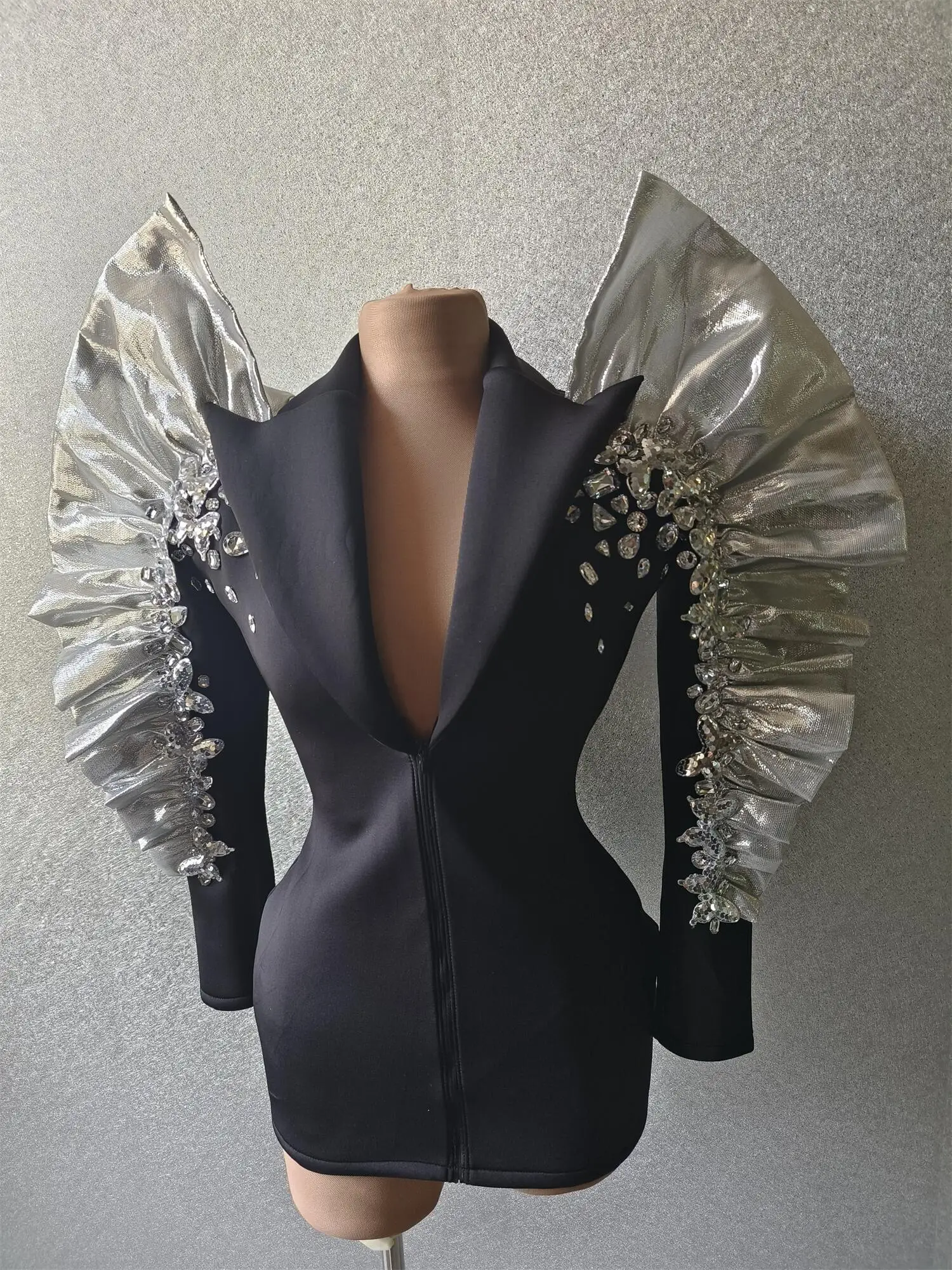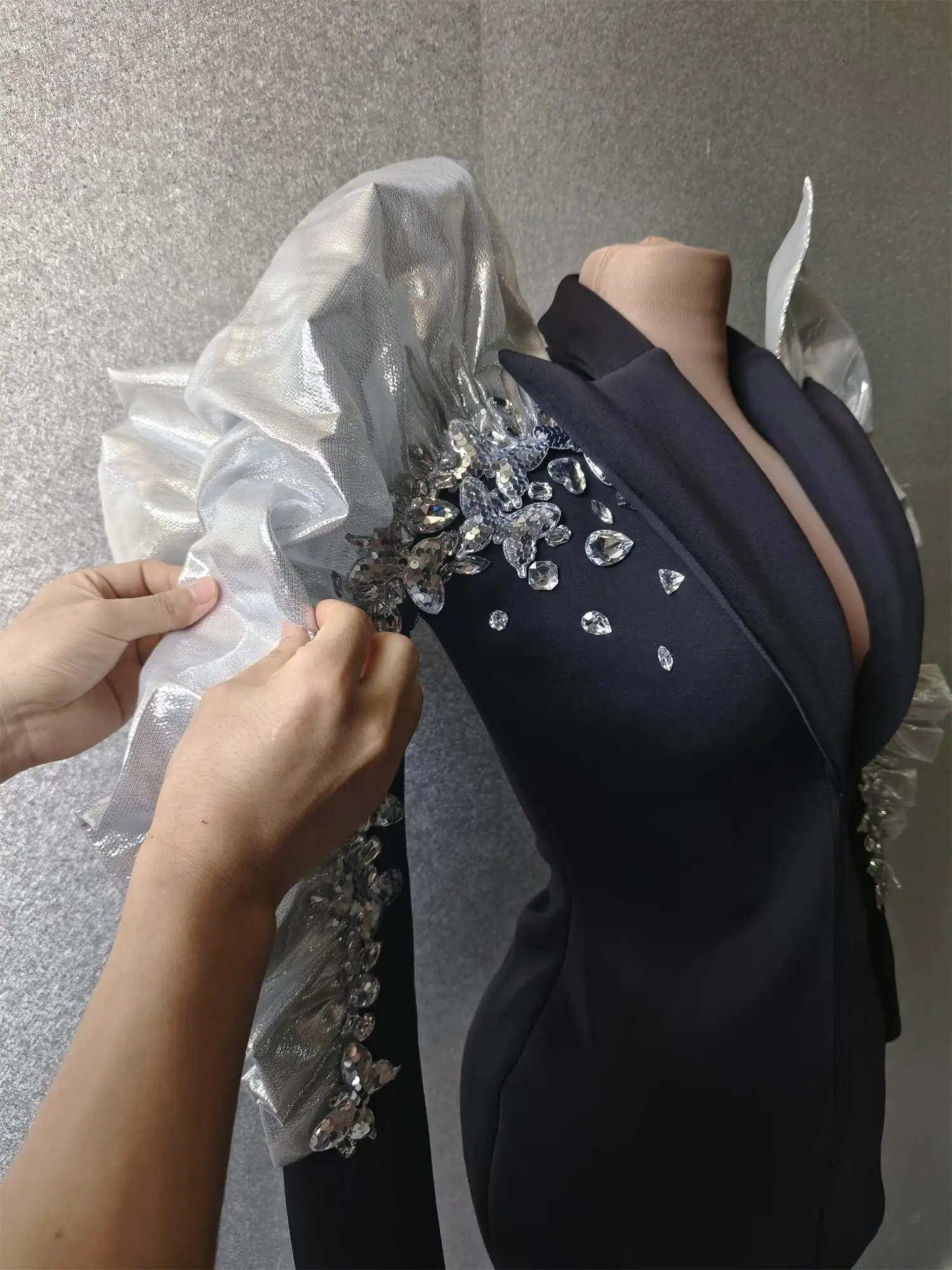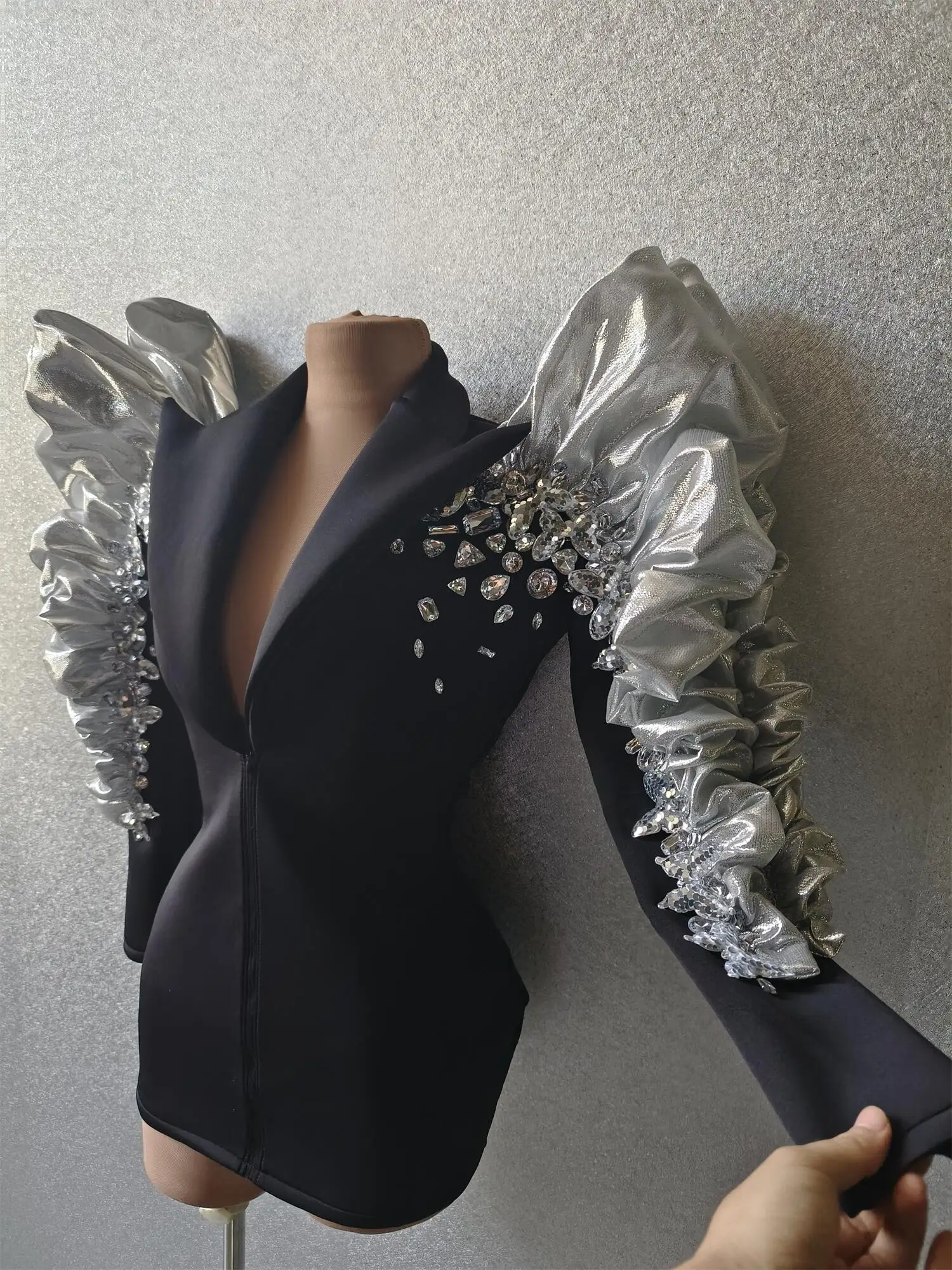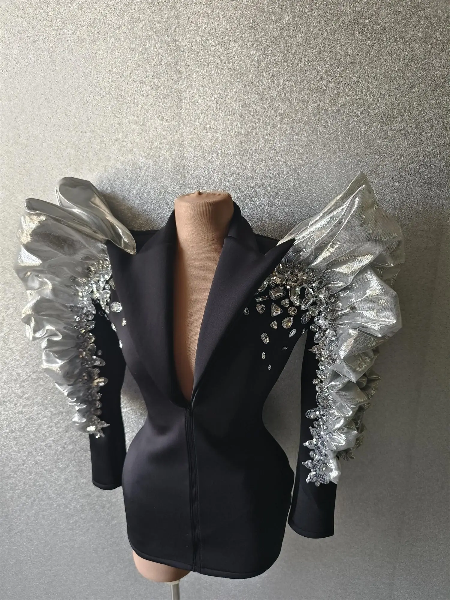 Women Black Blazer Design Sparkly Rhinestone Performance Dress Singer DJ DS Night Club Bar Stage Wear Drag Queen Costume Feiji