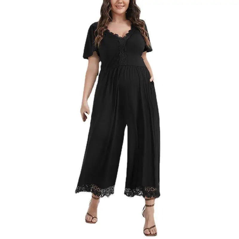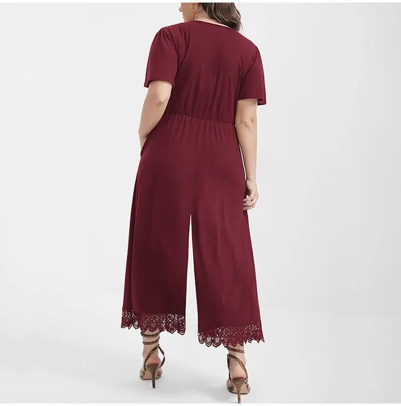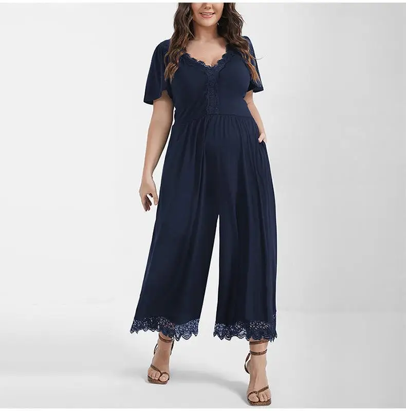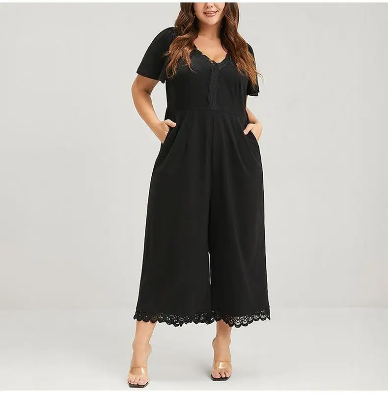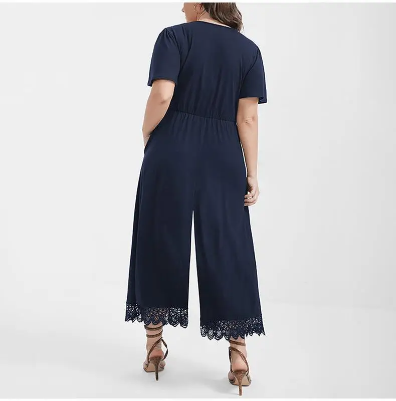 Women Jumpsuit 2024 Summer New Fashion Elegant Plus Size Female Knitted Lace Splicing Temperament Jumpsuit Casual Solid Color