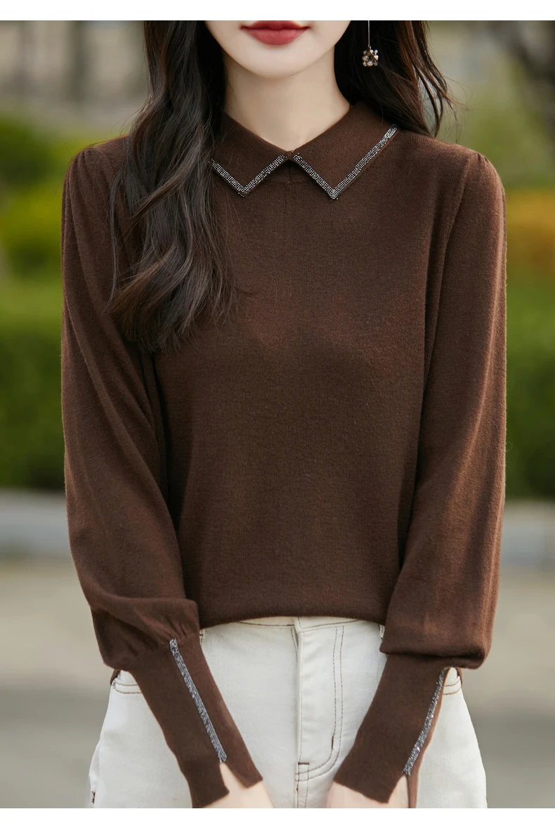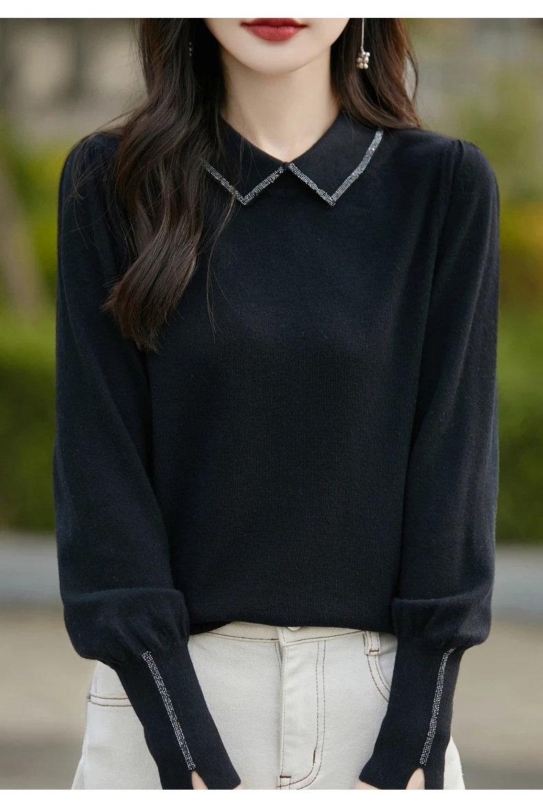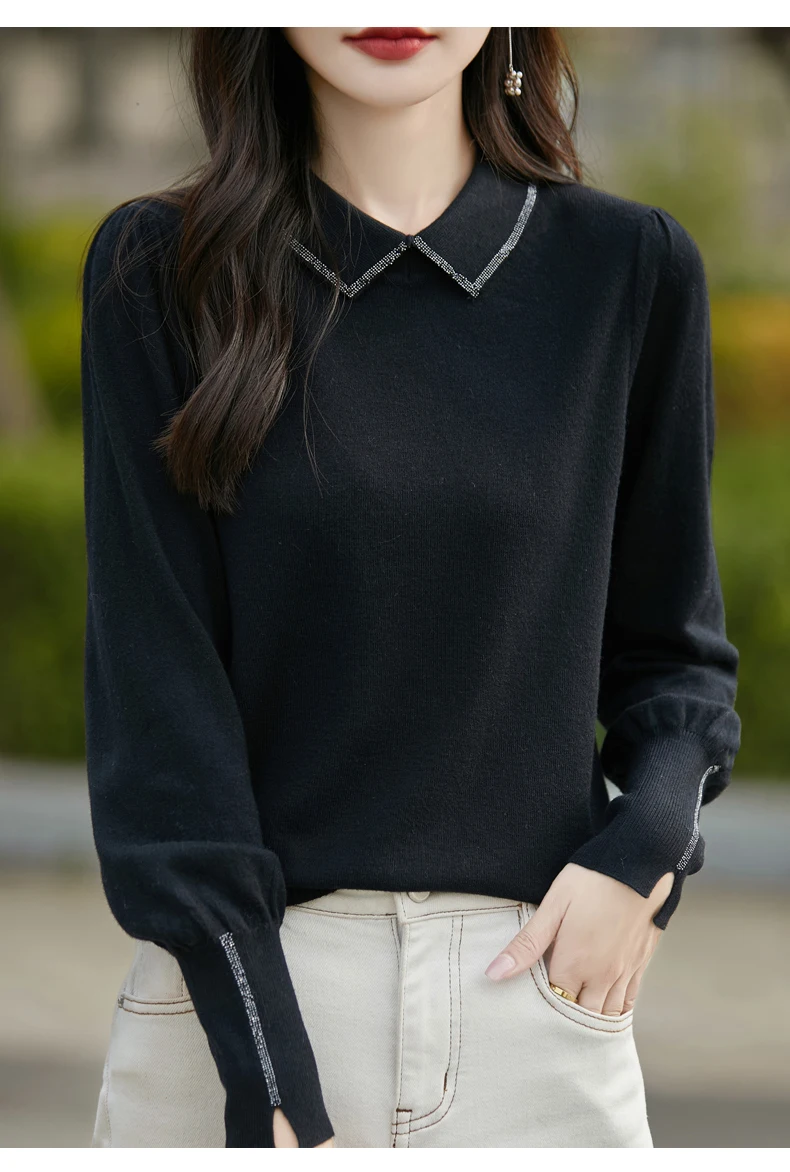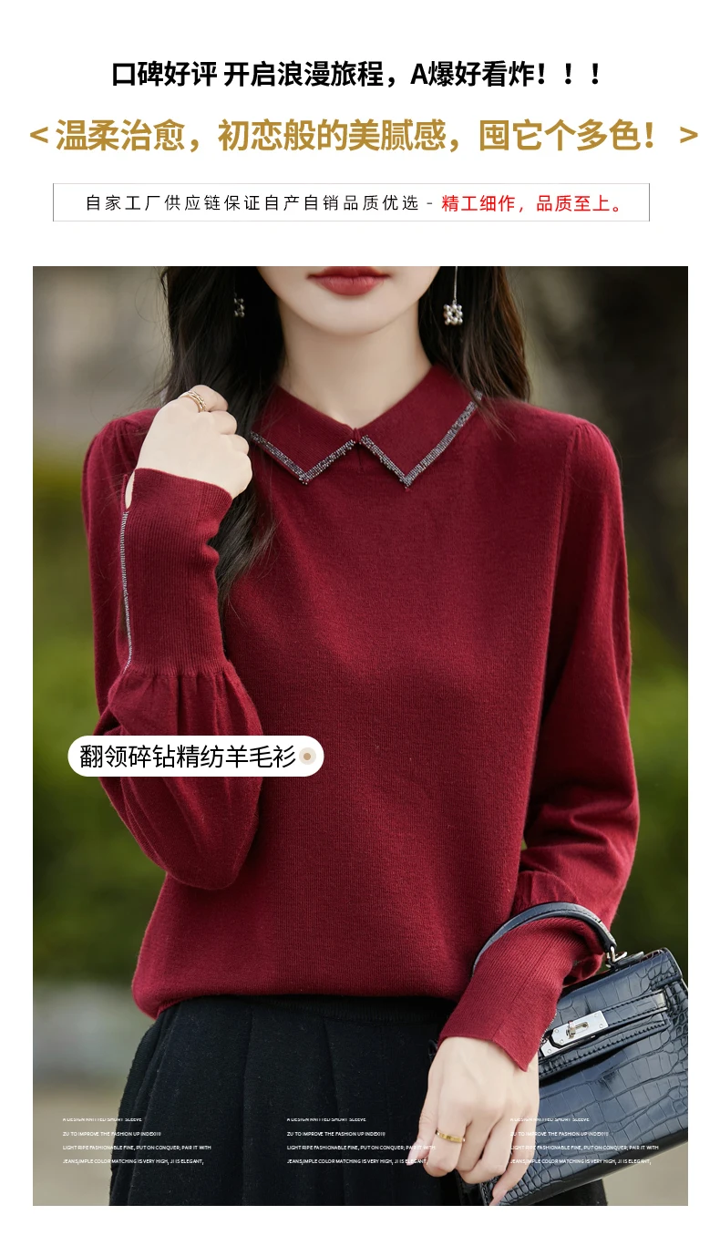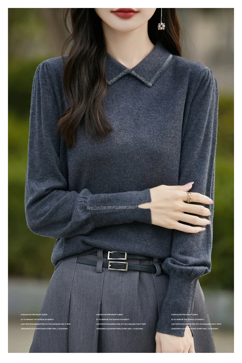 Women Merino Wool Sweater Polo Collar Lantern Sleeve Pullover Autumn Winter Knitted Clothing Diamond Long Sleeve Bottoming Tops