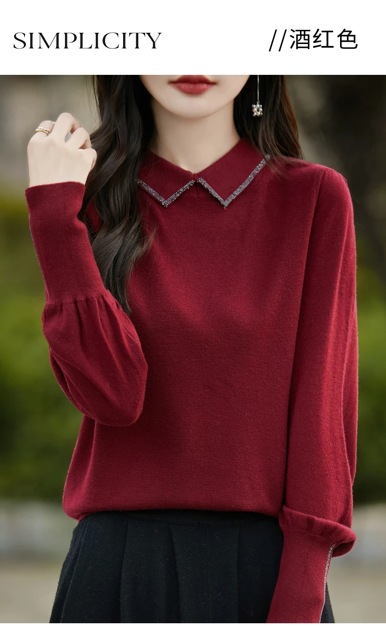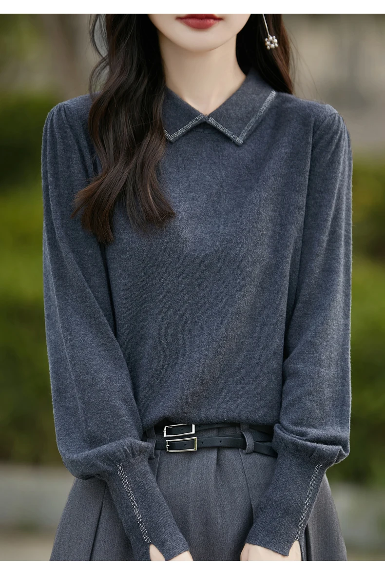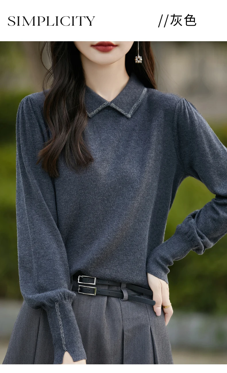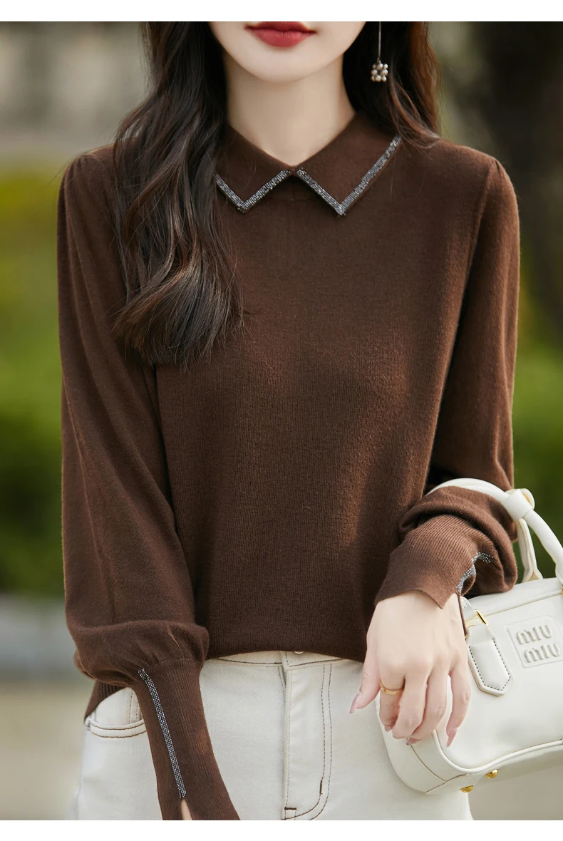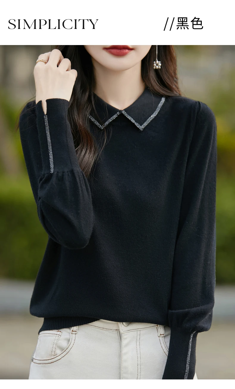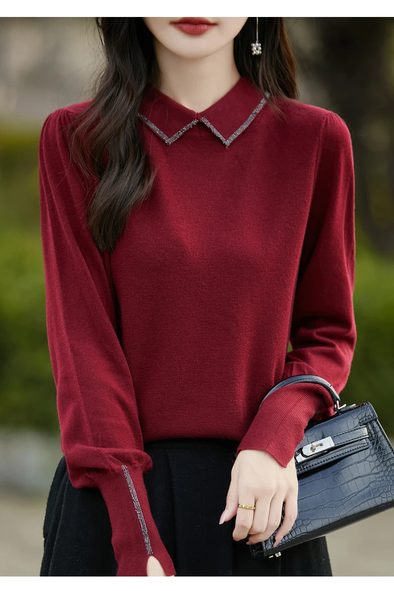 Women Merino Wool Sweater Polo Collar Lantern Sleeve Pullover Autumn Winter Knitted Clothing Diamond Long Sleeve Bottoming Tops