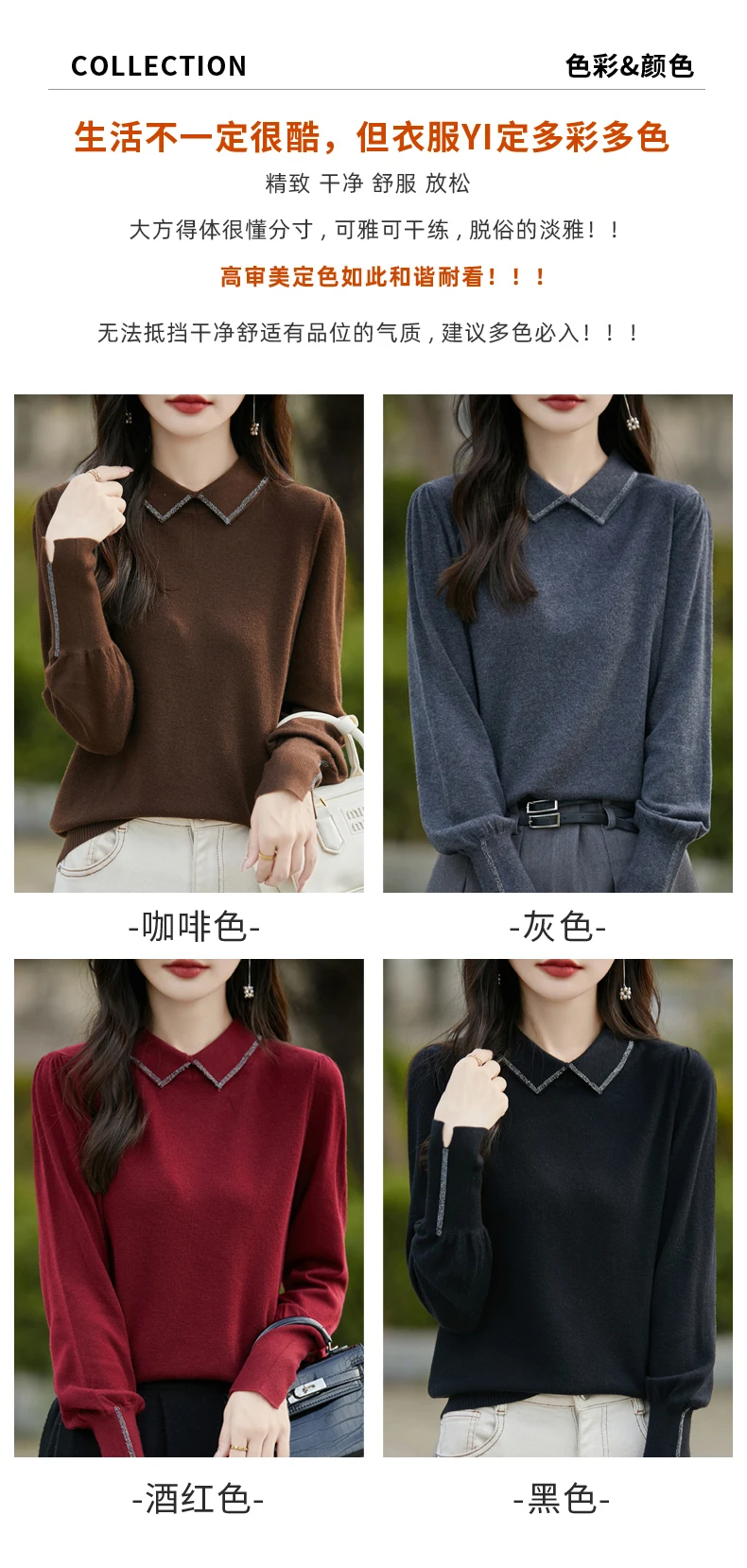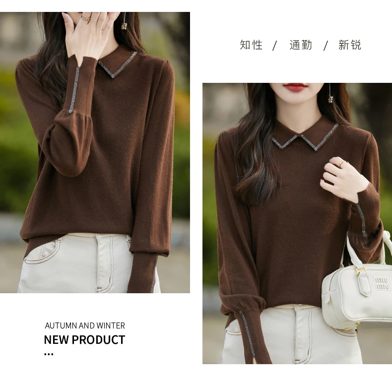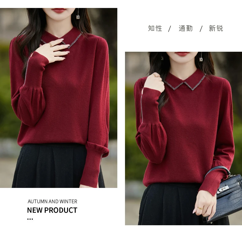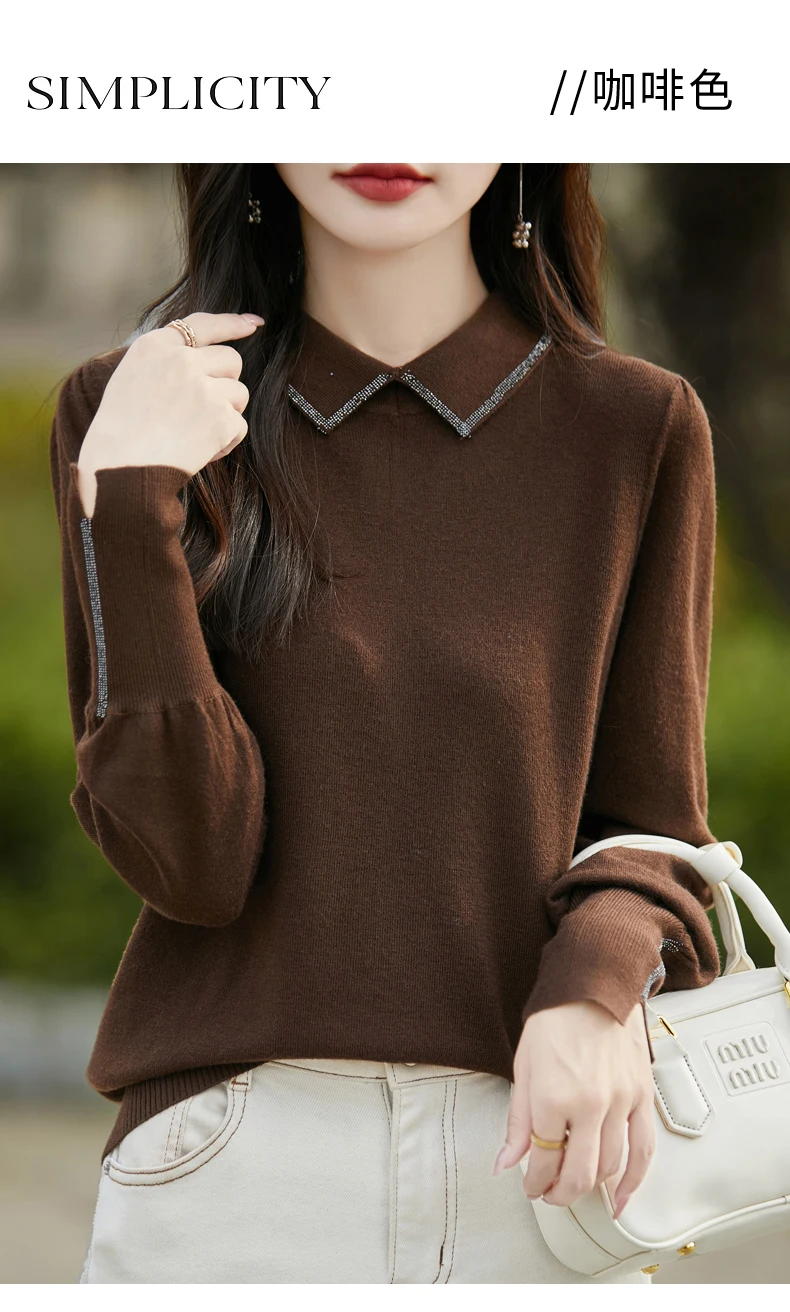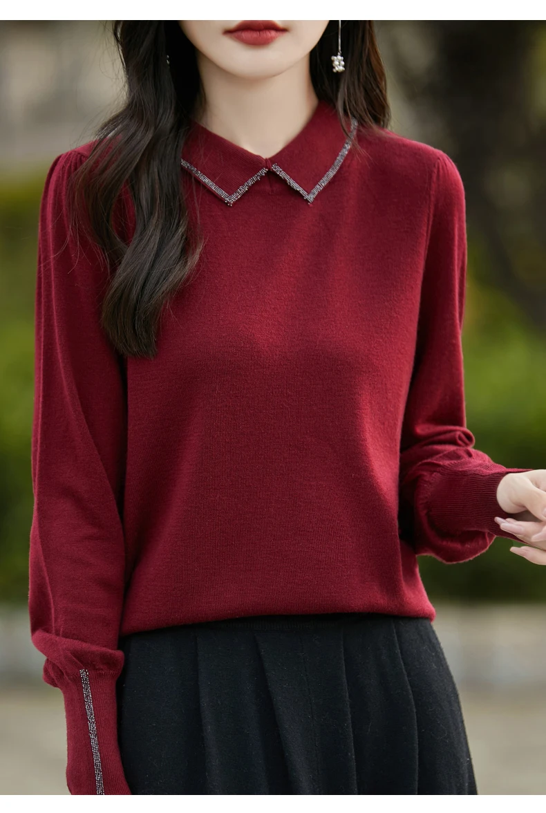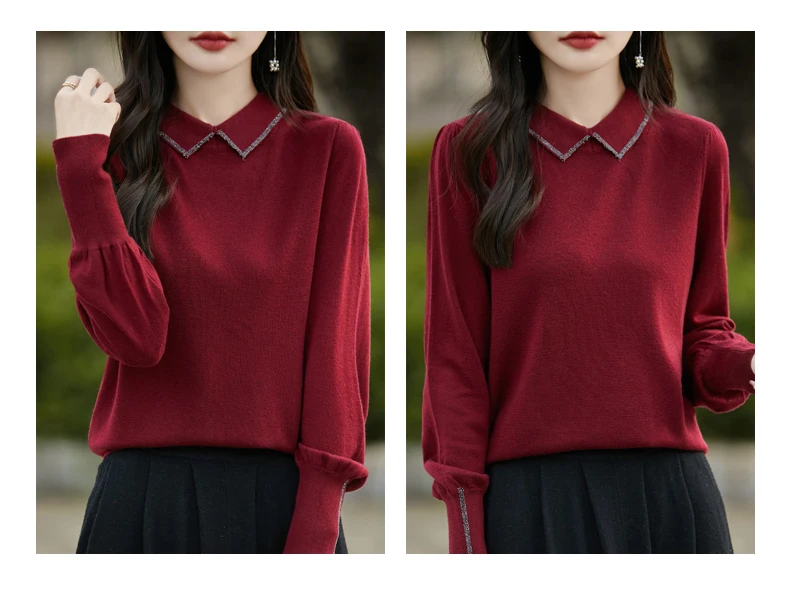 Women Merino Wool Sweater Polo Collar Lantern Sleeve Pullover Autumn Winter Knitted Clothing Diamond Long Sleeve Bottoming Tops